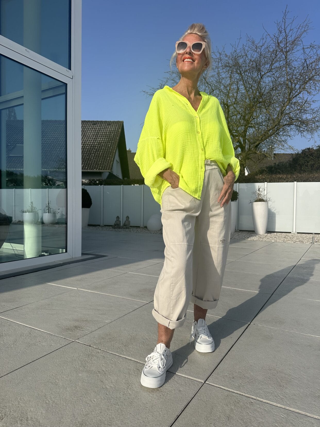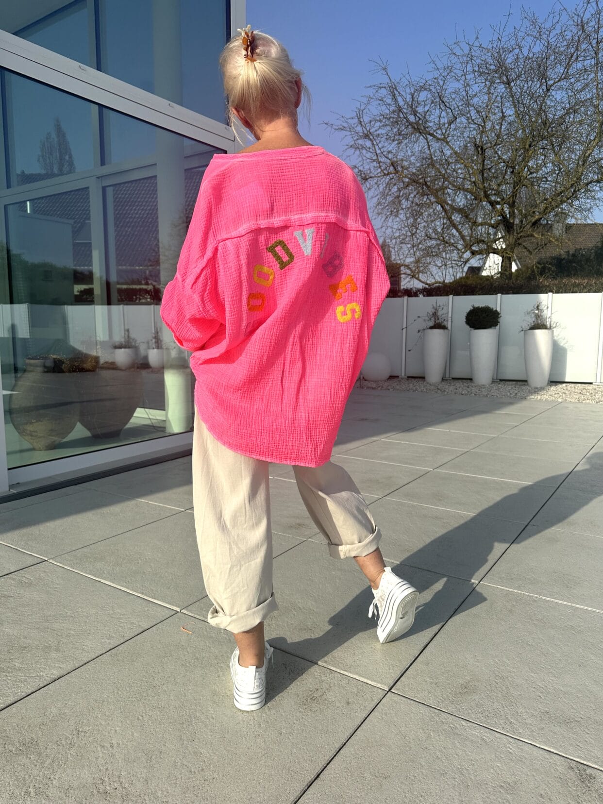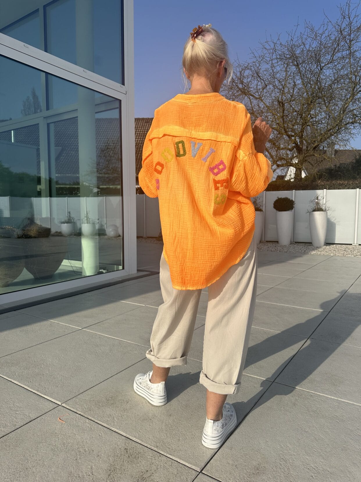 Muslin blouse in 3 vibrant colors with a colorful Goodvibes motif on the back.