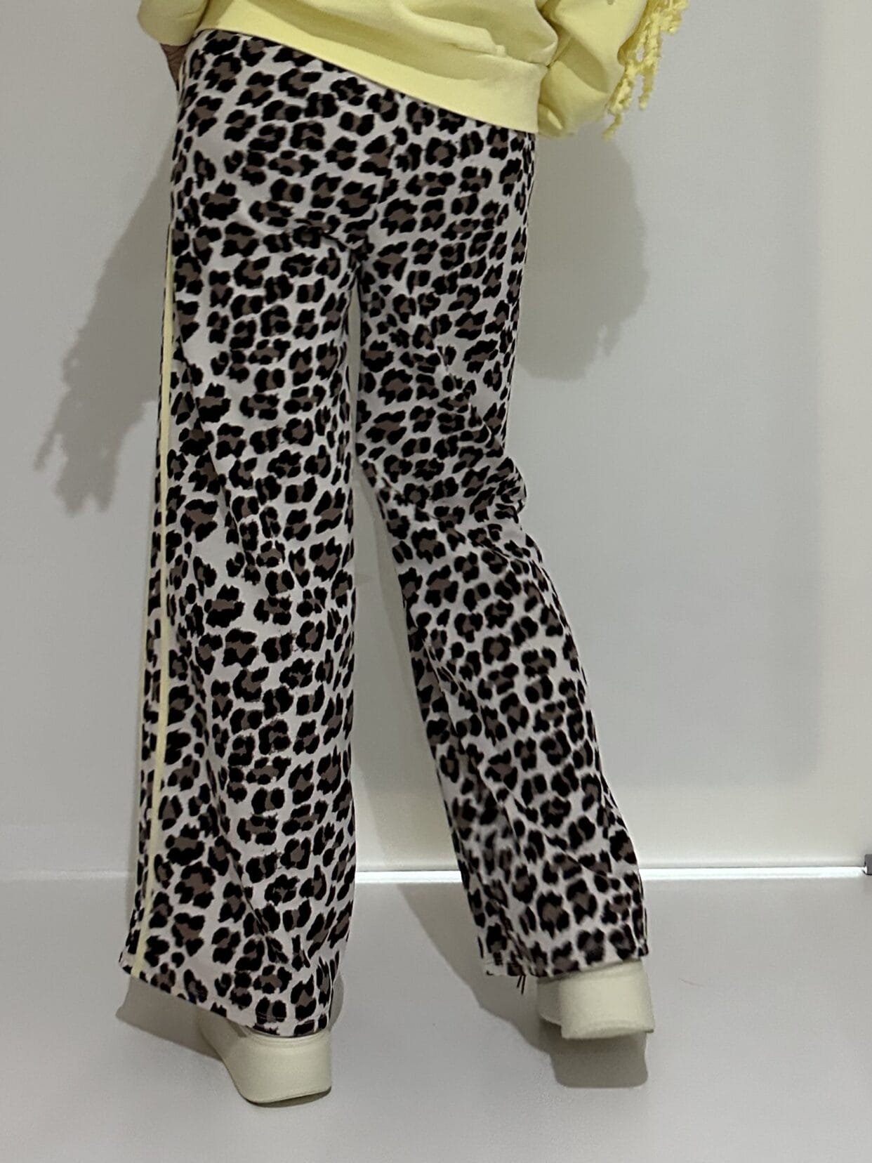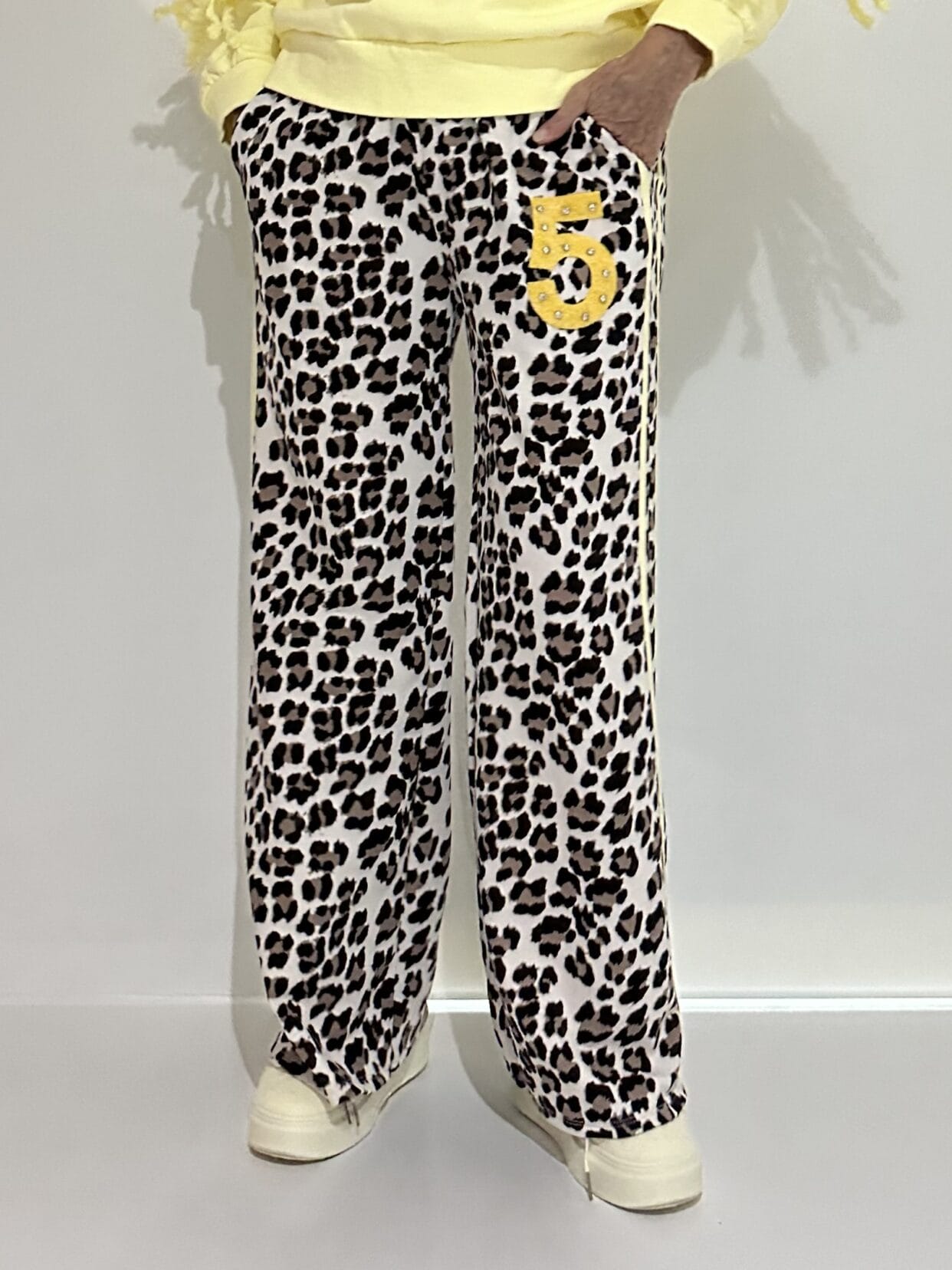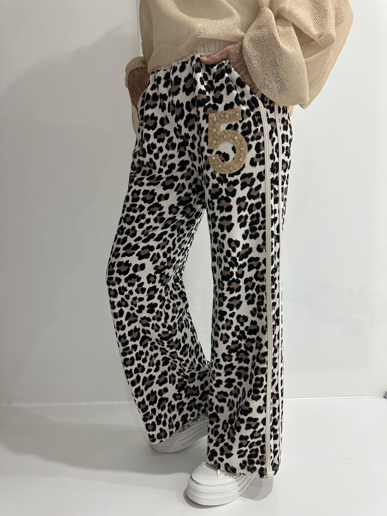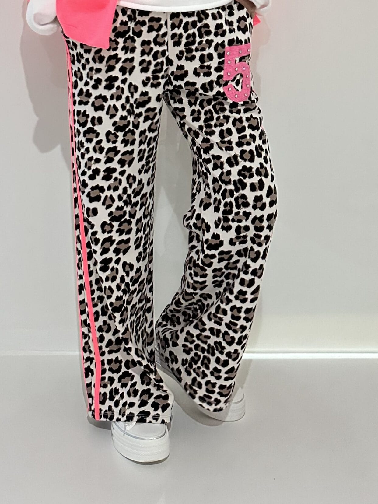 Pull-on trousers in an animal print with color-matched glitter detail in 4 color styles.