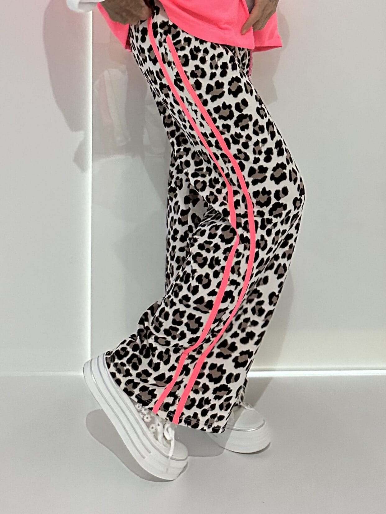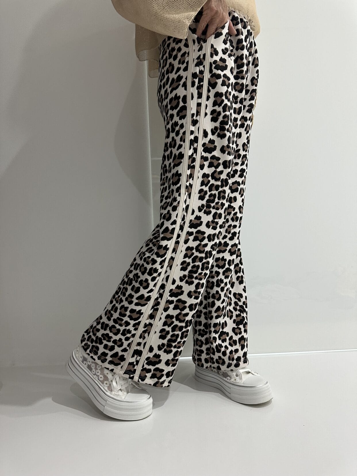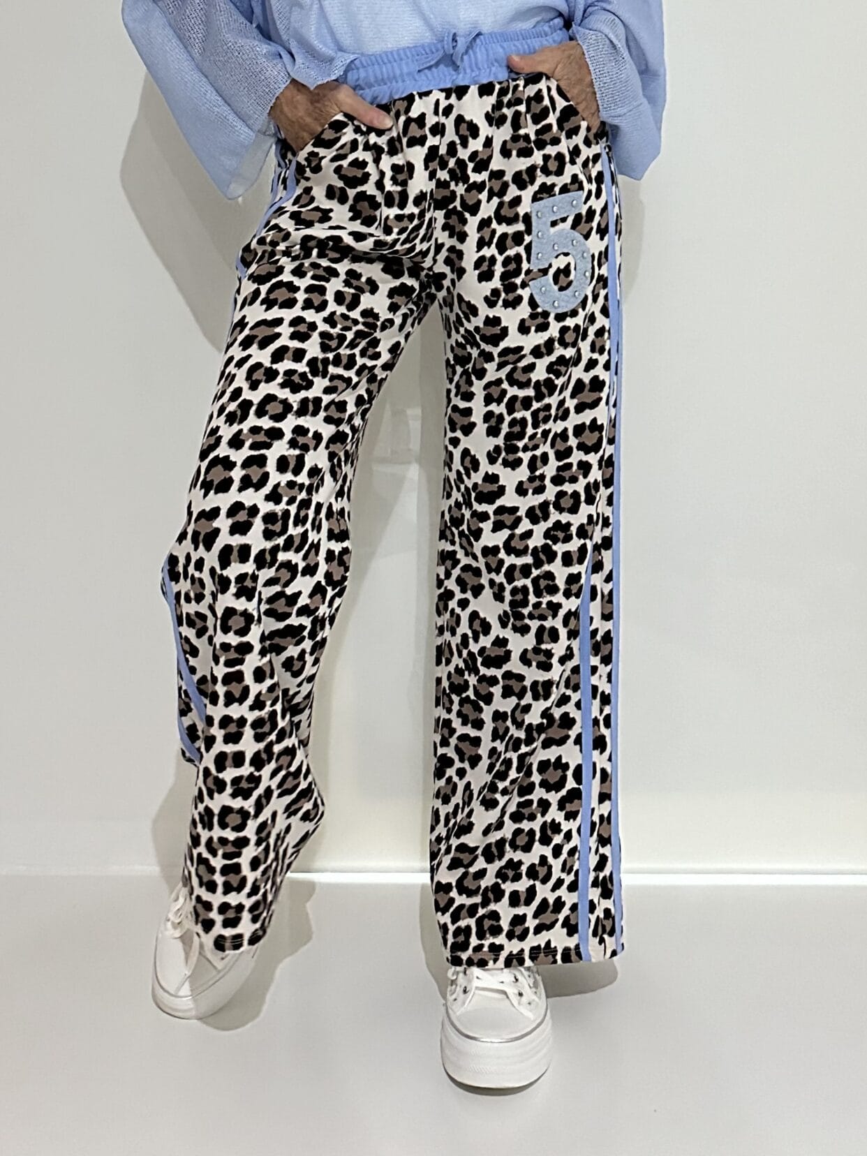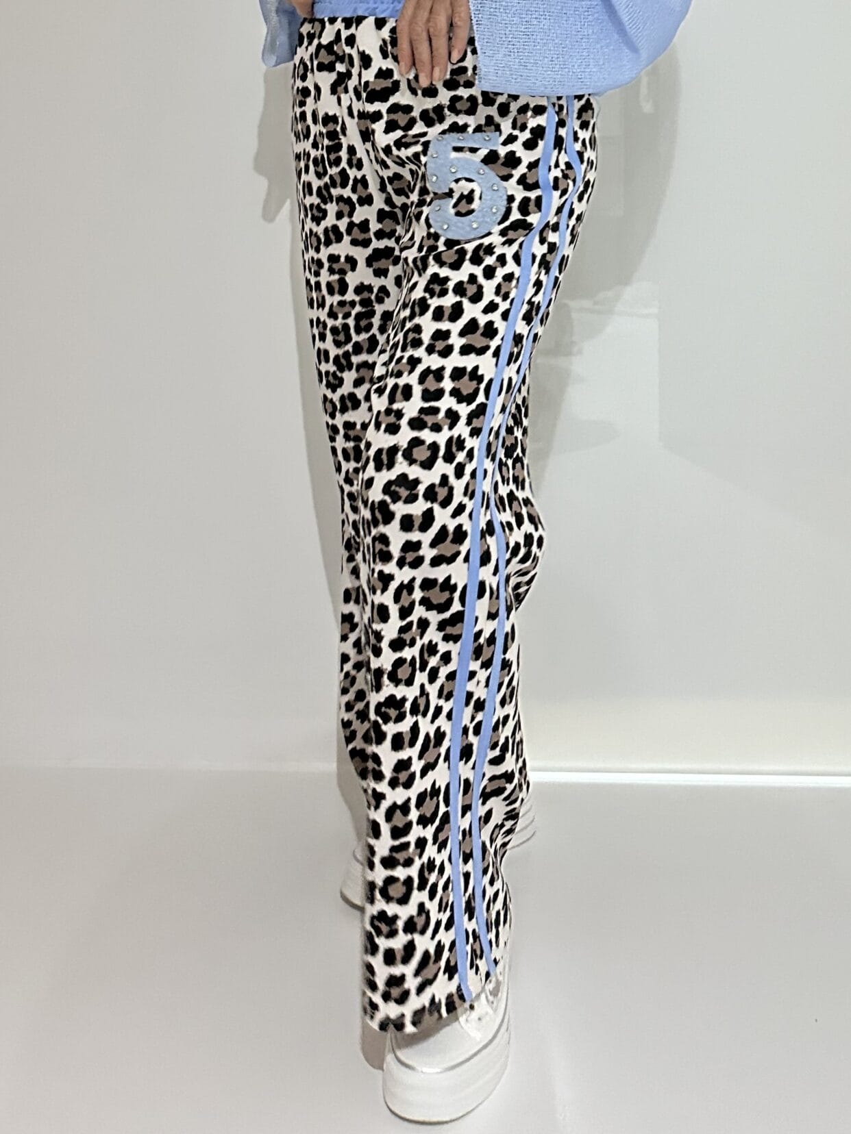 Pull-on trousers in an animal print with color-matched glitter detail in 4 color styles.