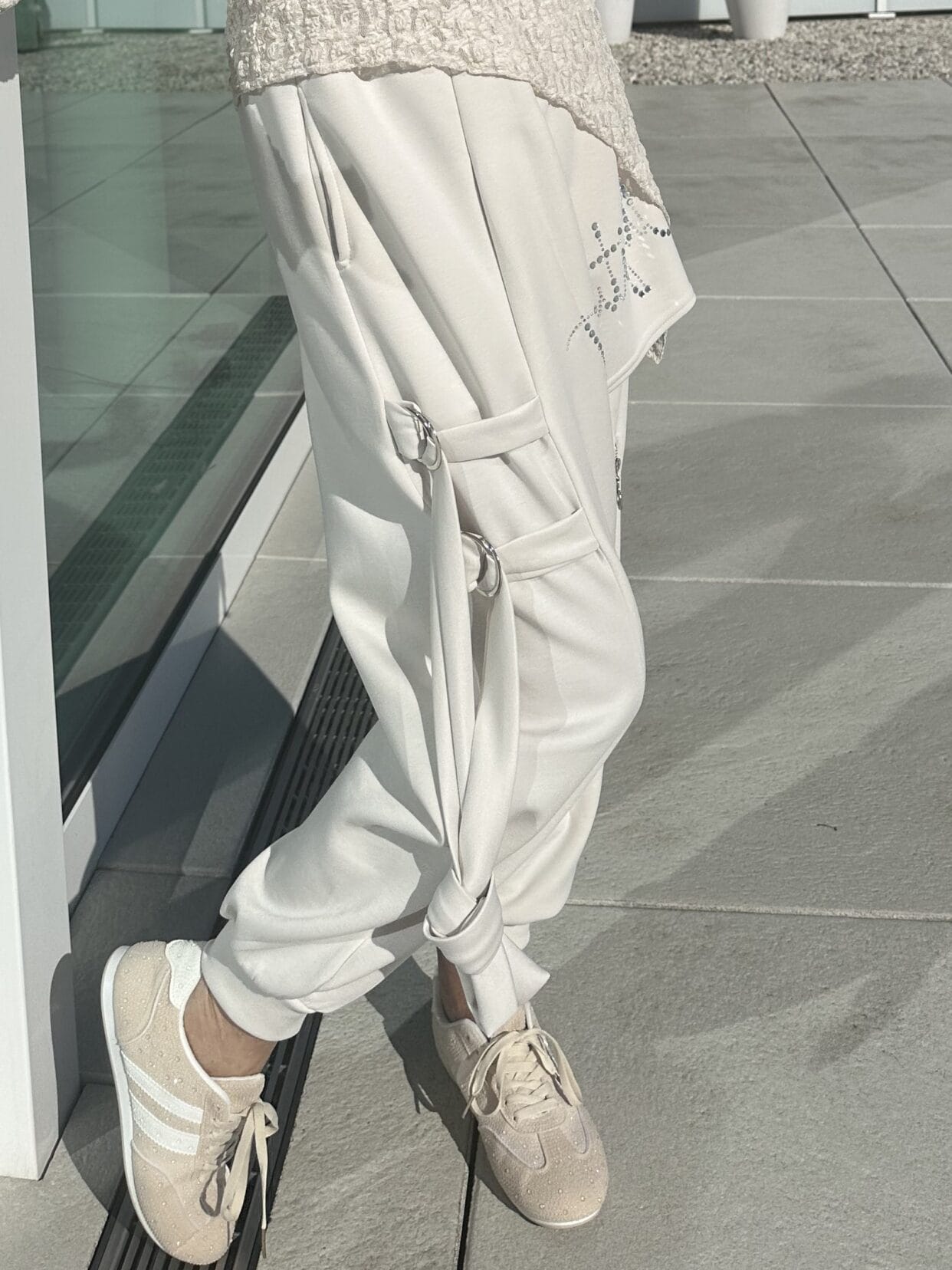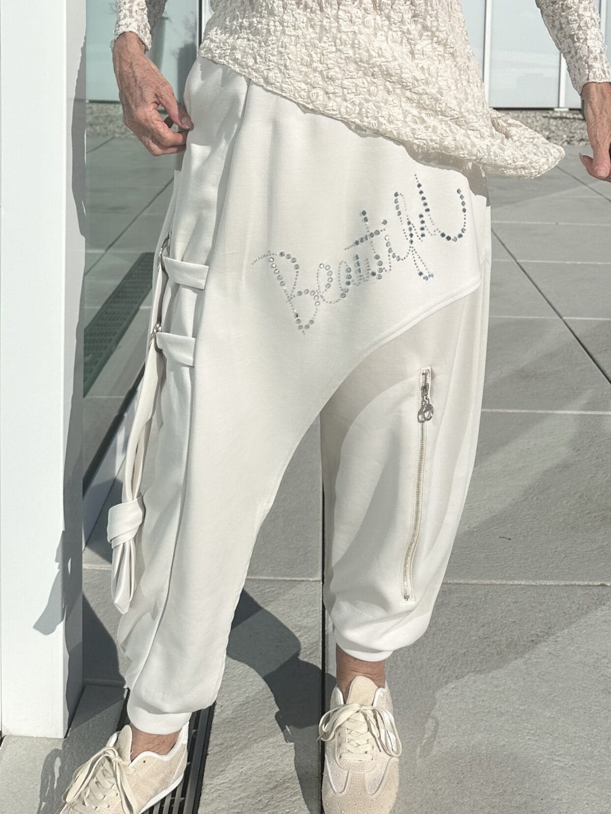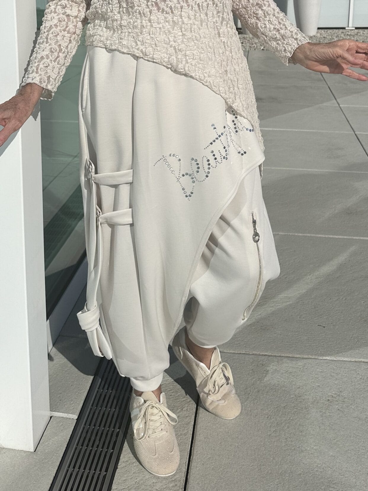 Unusual, cream-colored pull-on trousers with a glitter apron and other details.