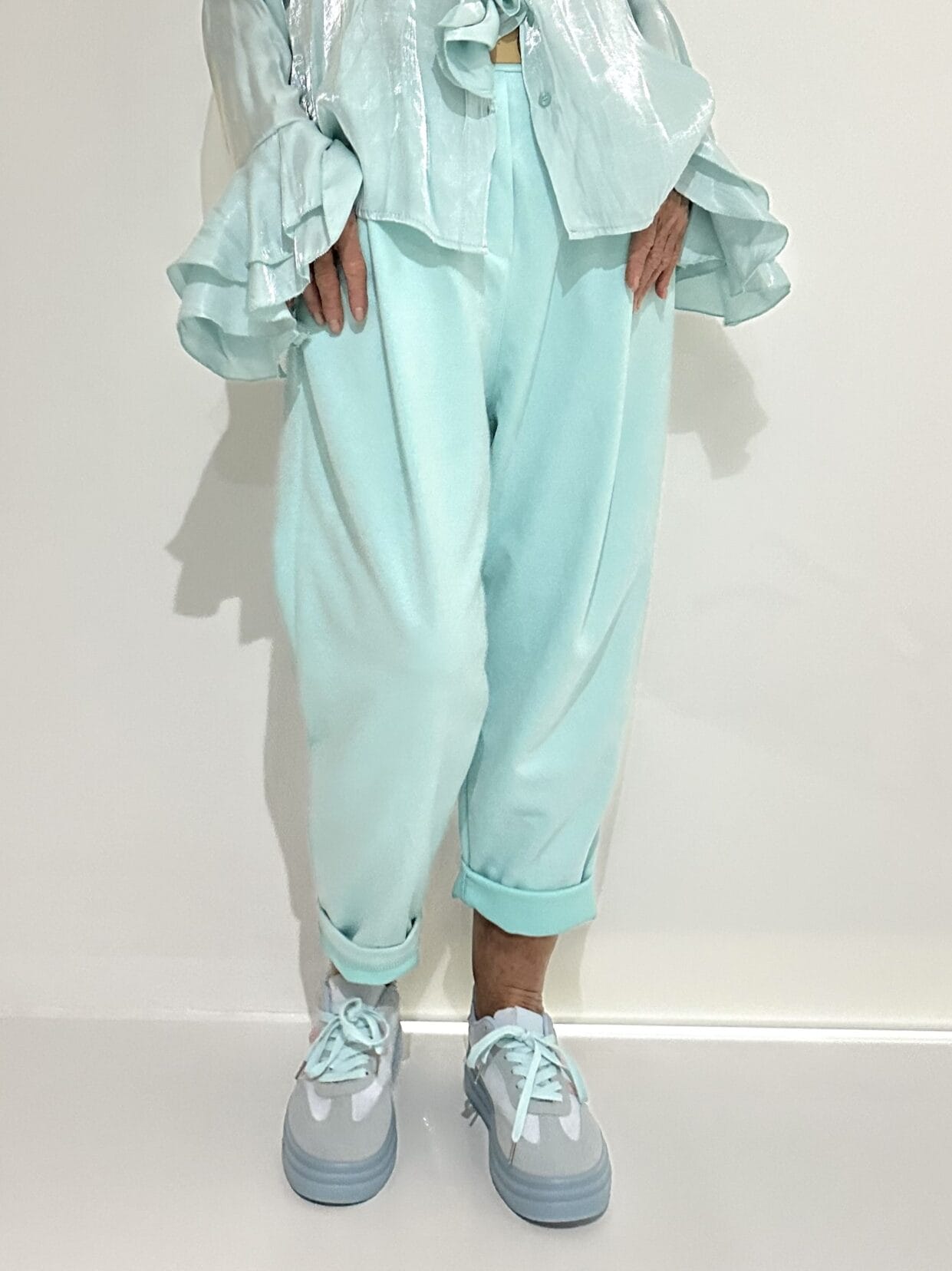 Turquoise pull-on trousers in boyfriend style with a light beige belt.
