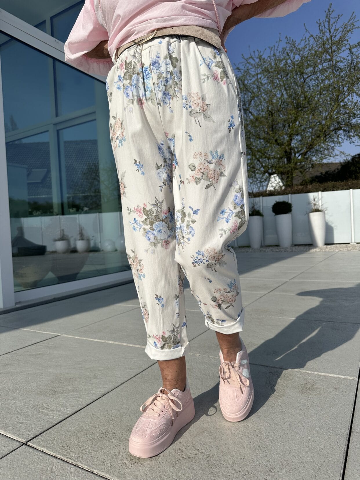 Pull-on trousers with a light-colored belt and colorful flower garden motifs.