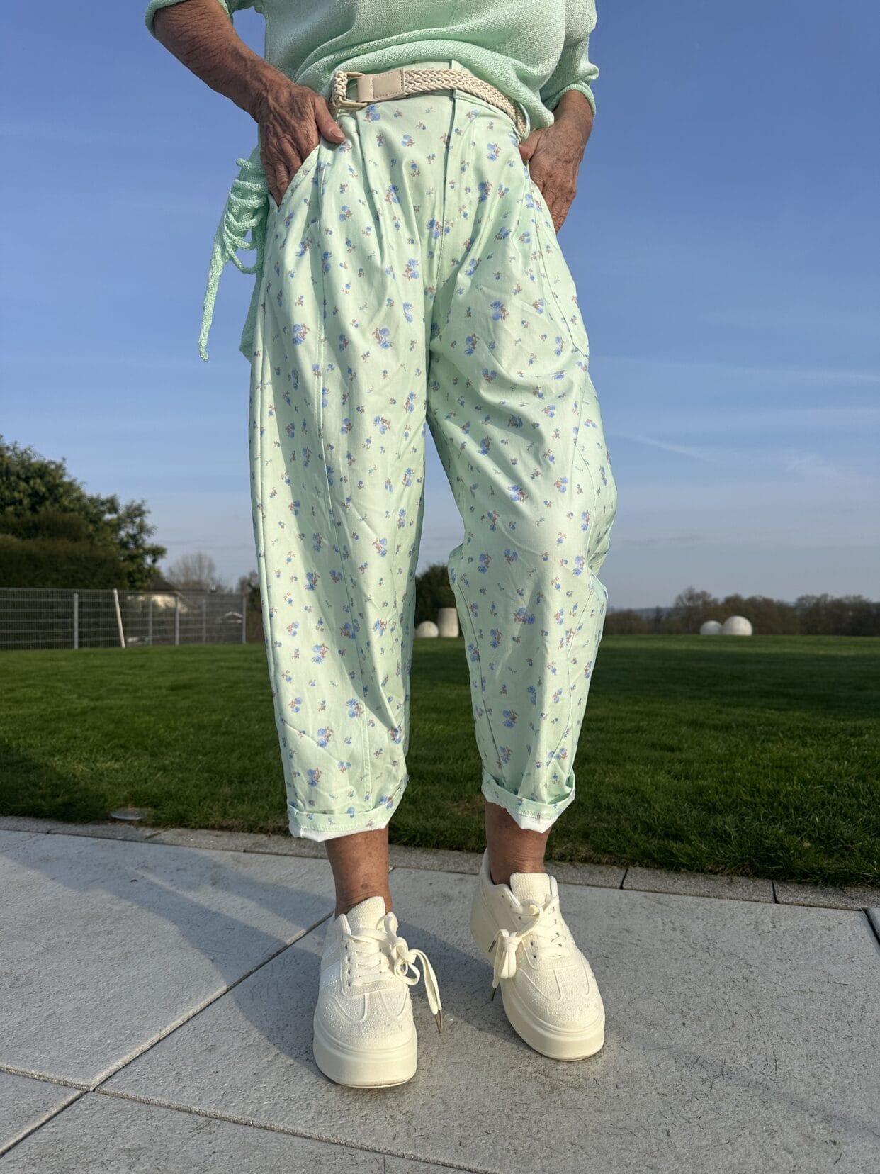 Wide-cut pull-on trousers with small blue floral motifs and a braided belt.