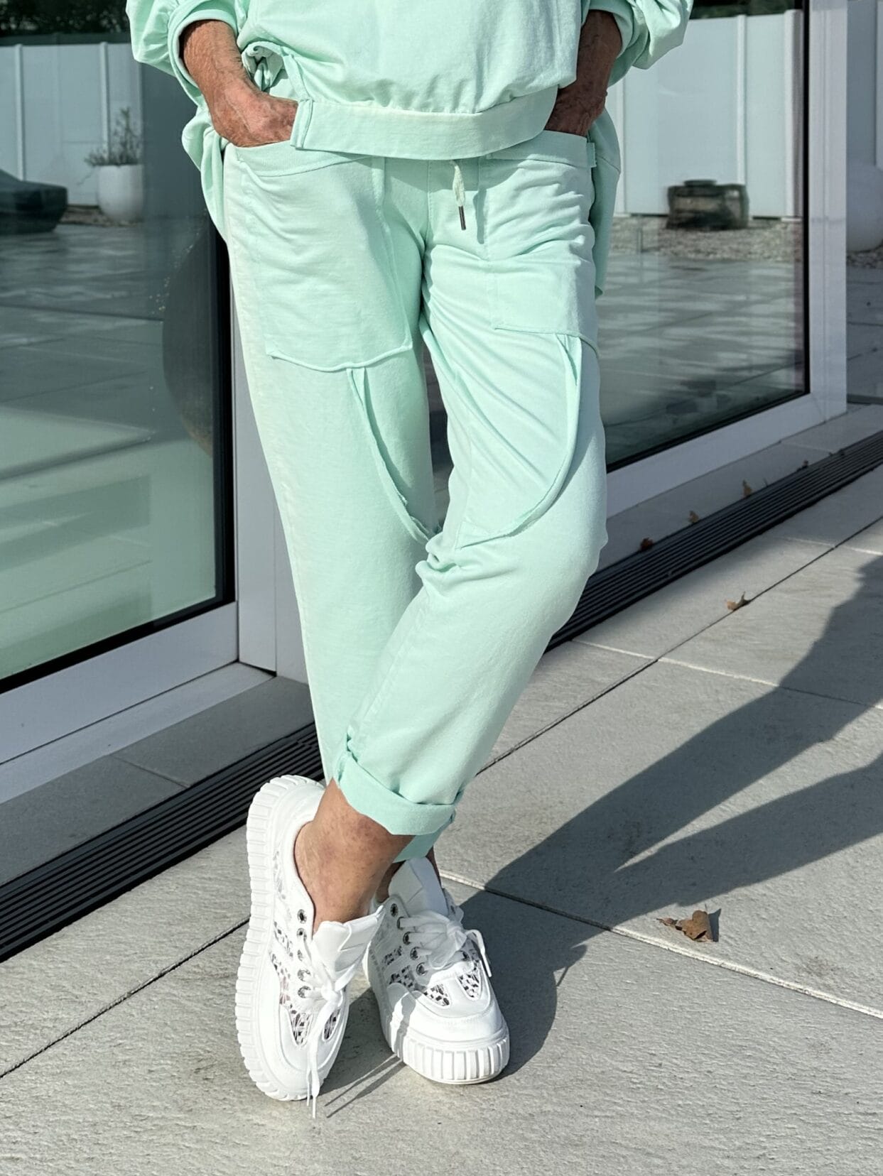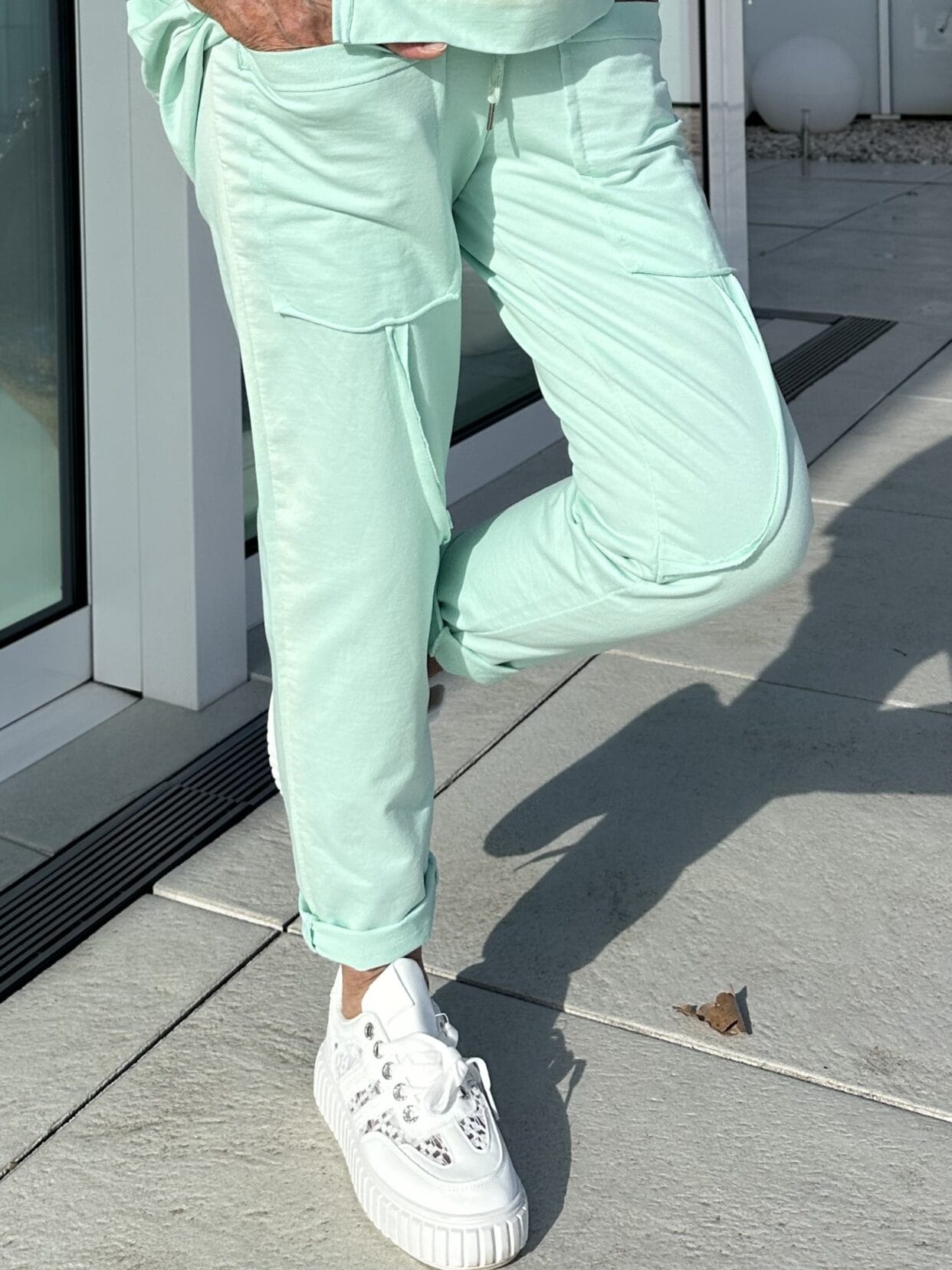Lightweight pull-on trousers with two large patch pockets and other details.
