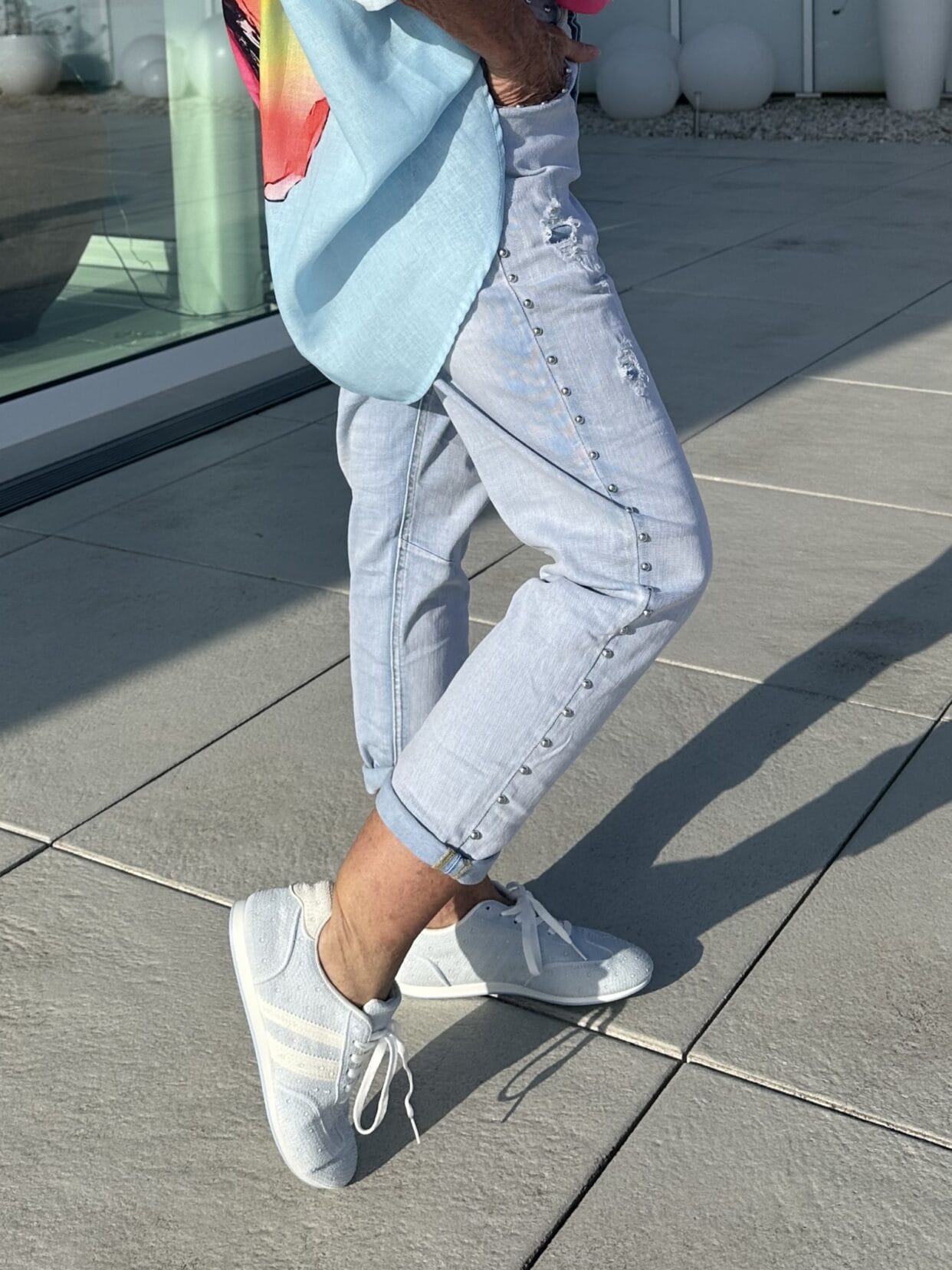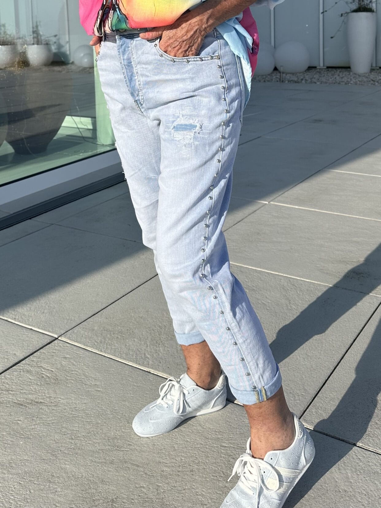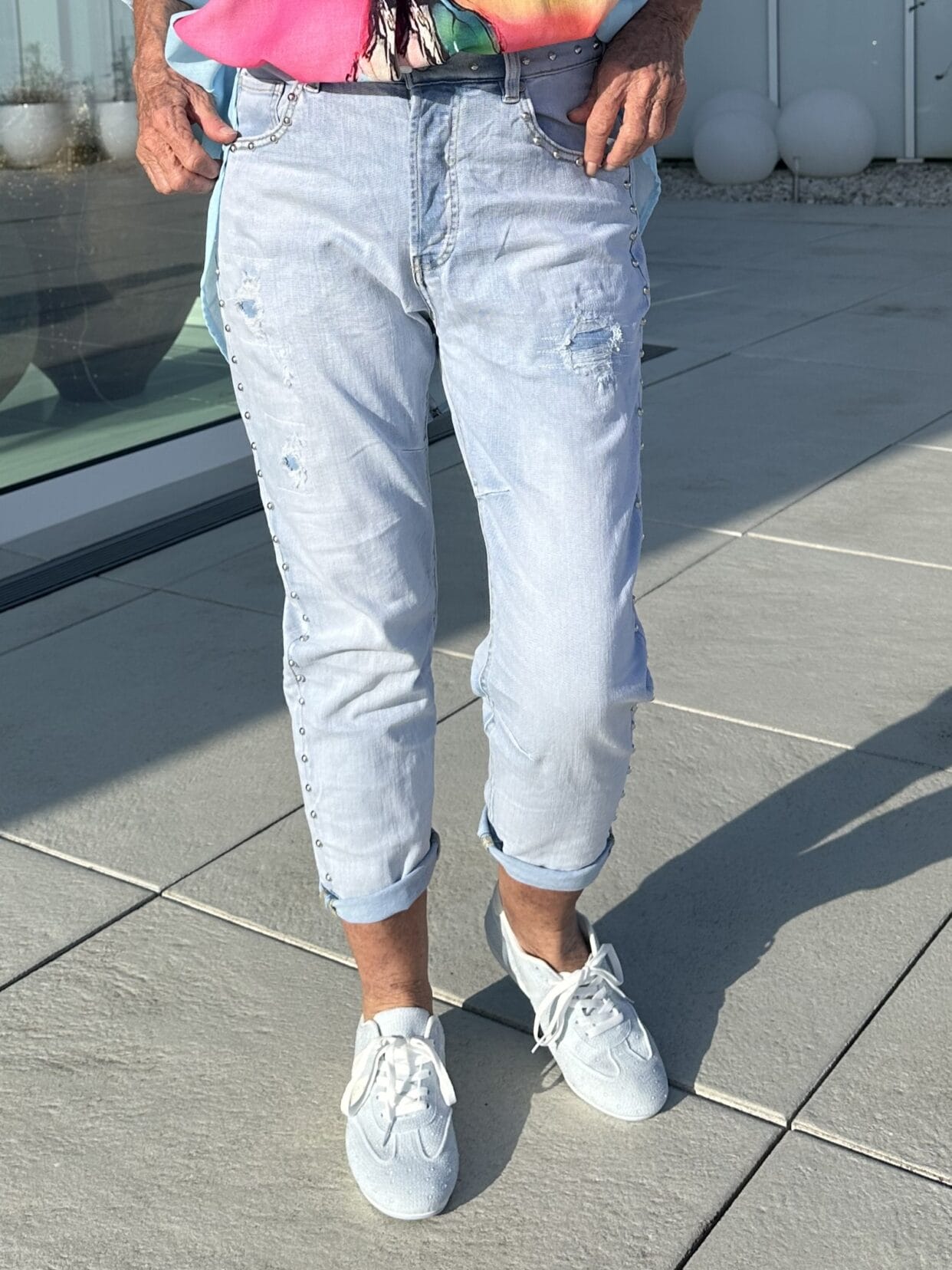 Light blue jeans in a used style with silver rivets on the sides, waistband and pockets.