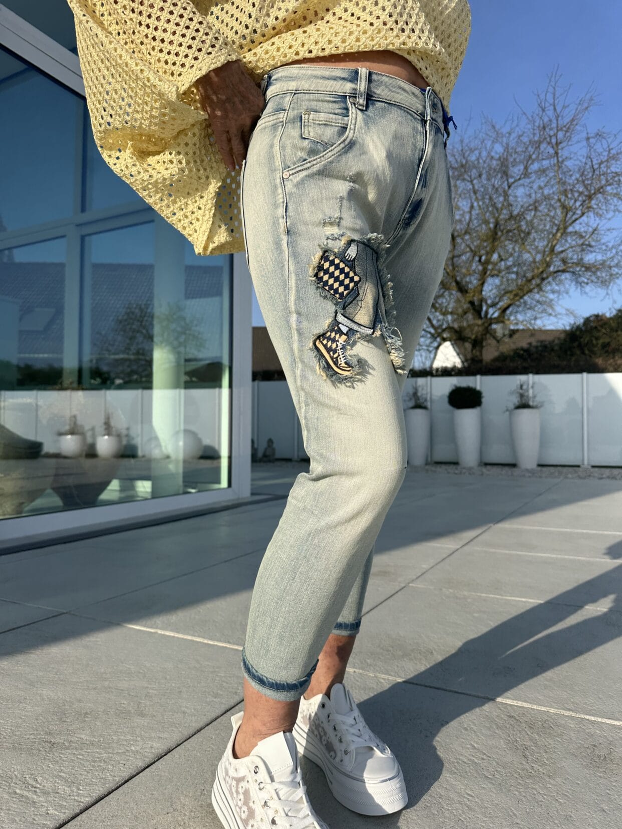 Light blue, washed-out used jeans with a frayed, sewn-on motif on the leg.