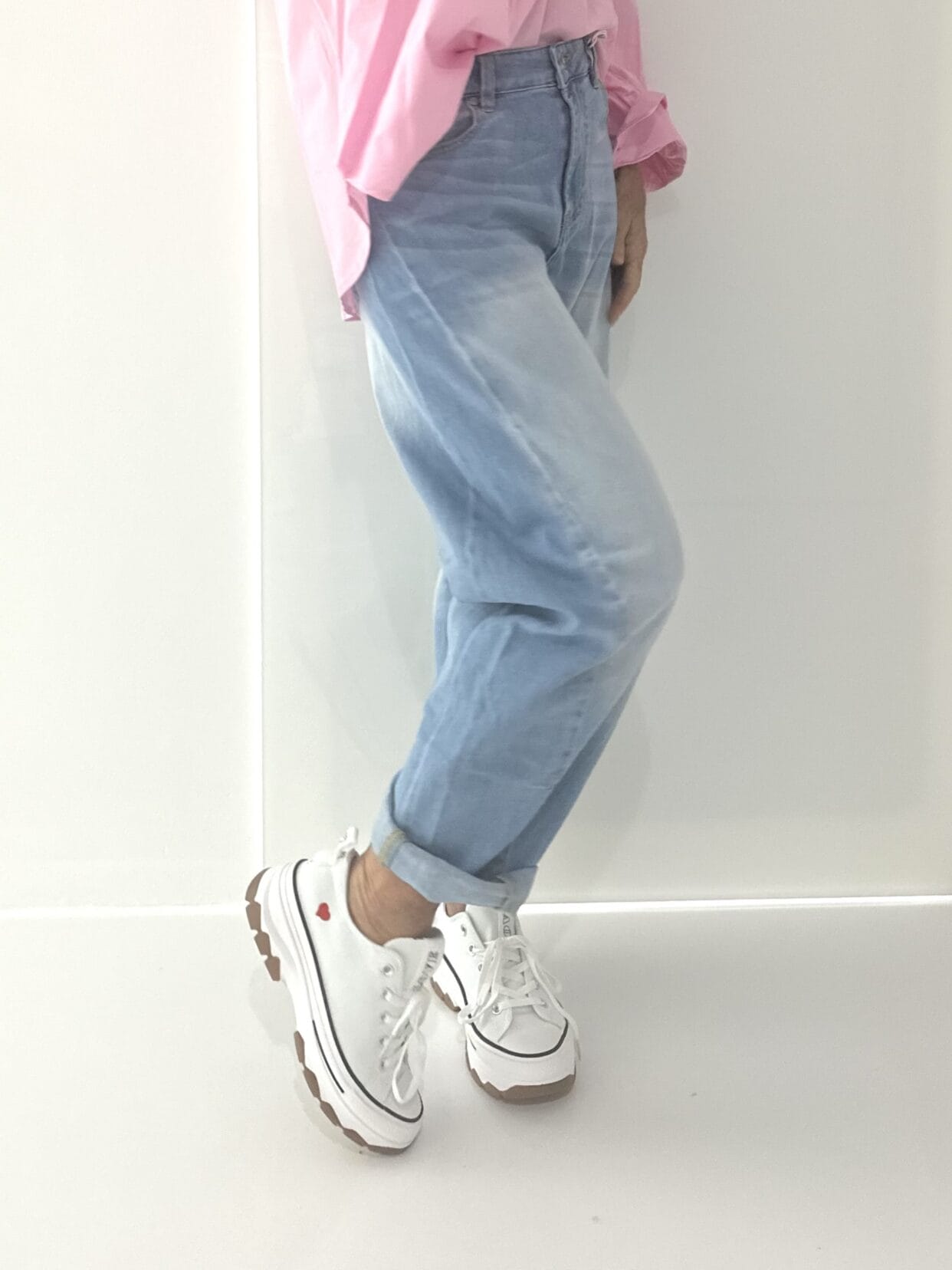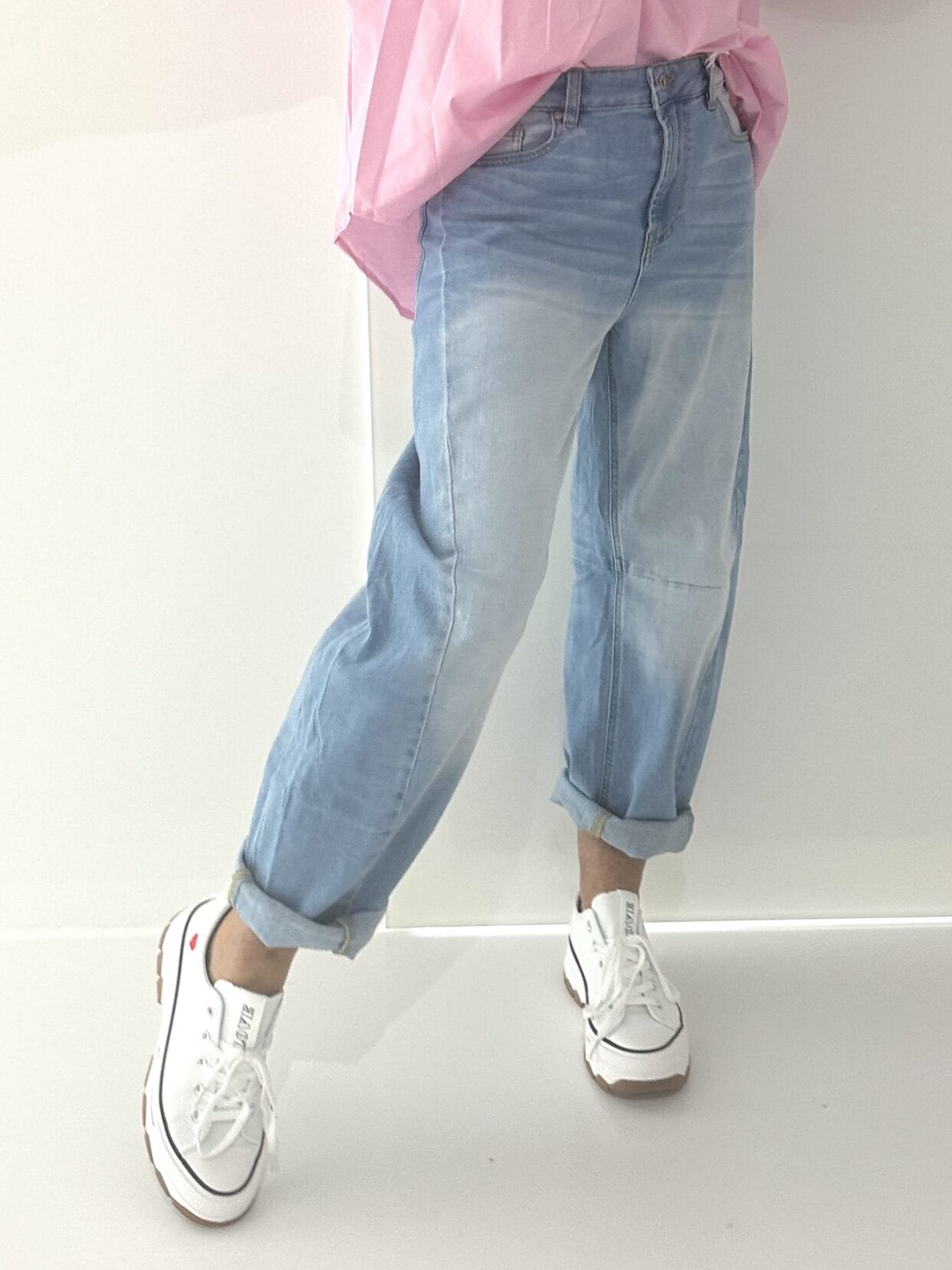 Light wash blue jeans. The jeans run large but are designed to be worn loose.