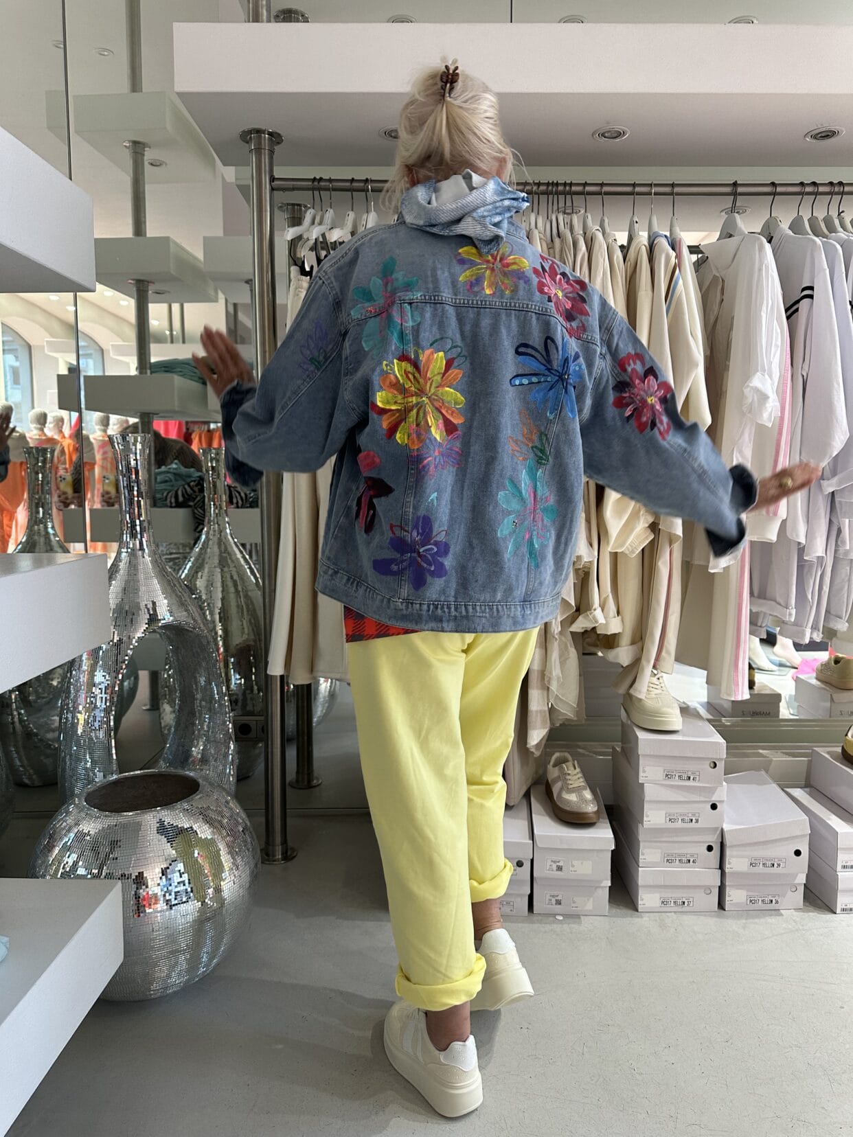 Denim jacket with painted, colorful floral motifs on the back.