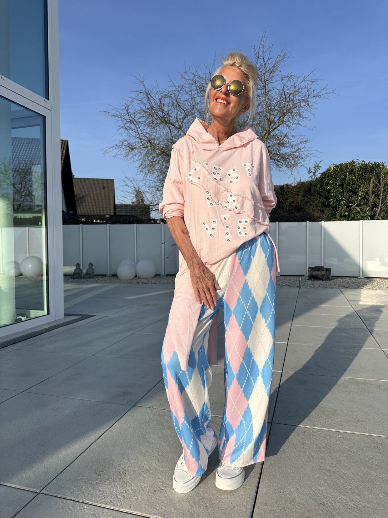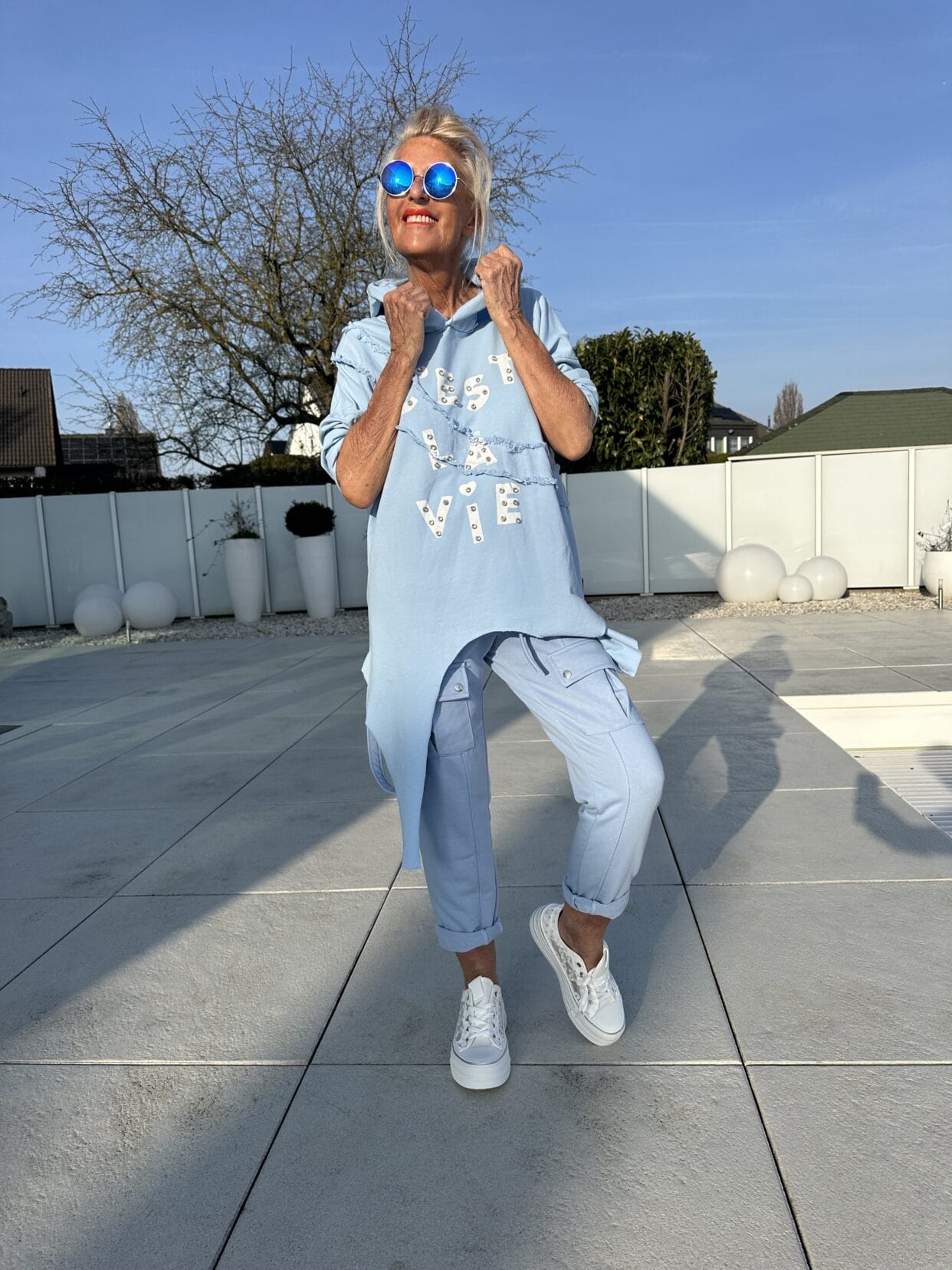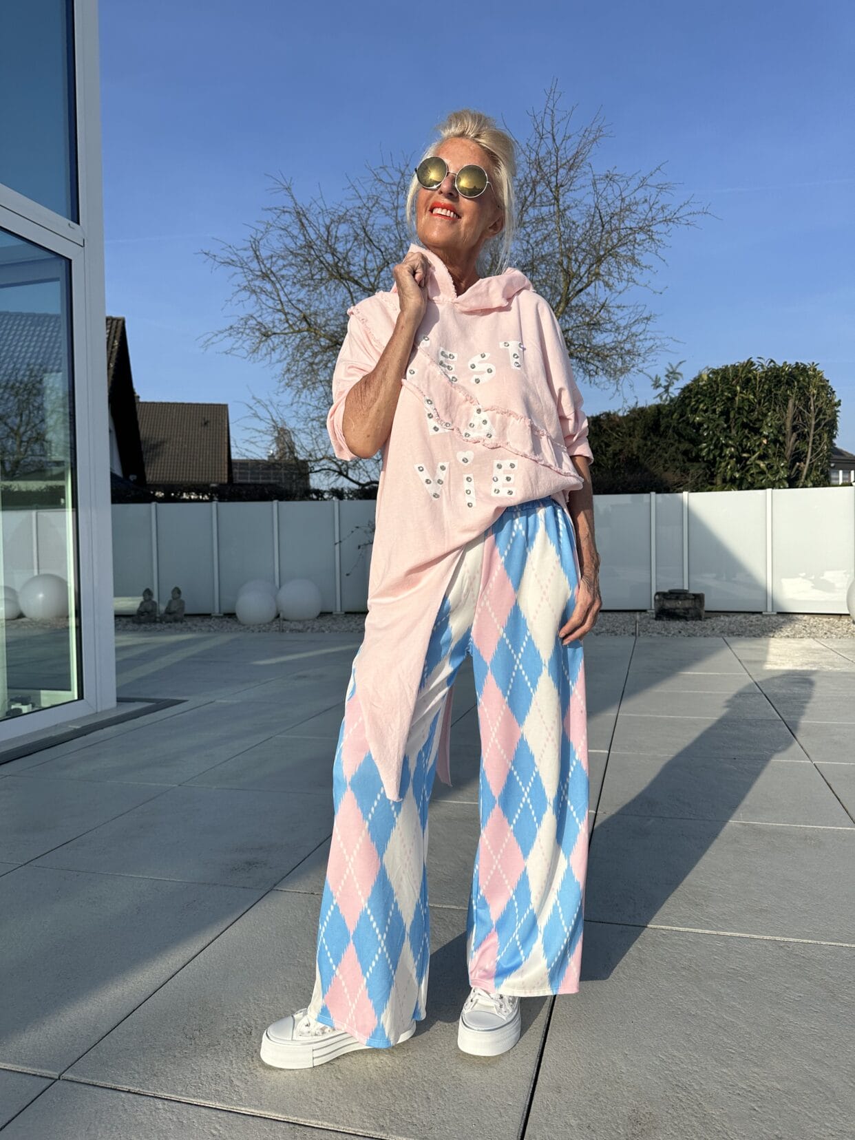 Long, asymmetrical cut sweater with glittery text pattern and hood.