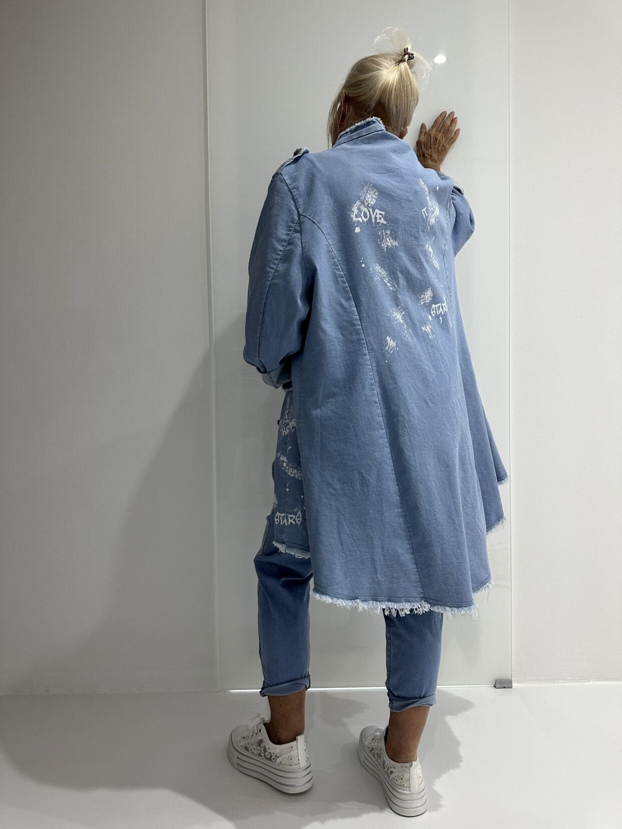 Fringed denim short coat with silver decorative buttons and white paint motifs.