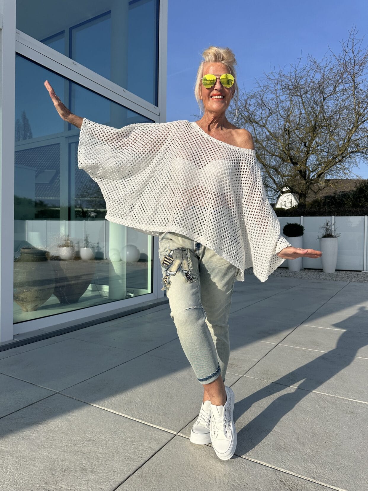 Oversized mesh sweater in yellow with gold and white with silver coating.