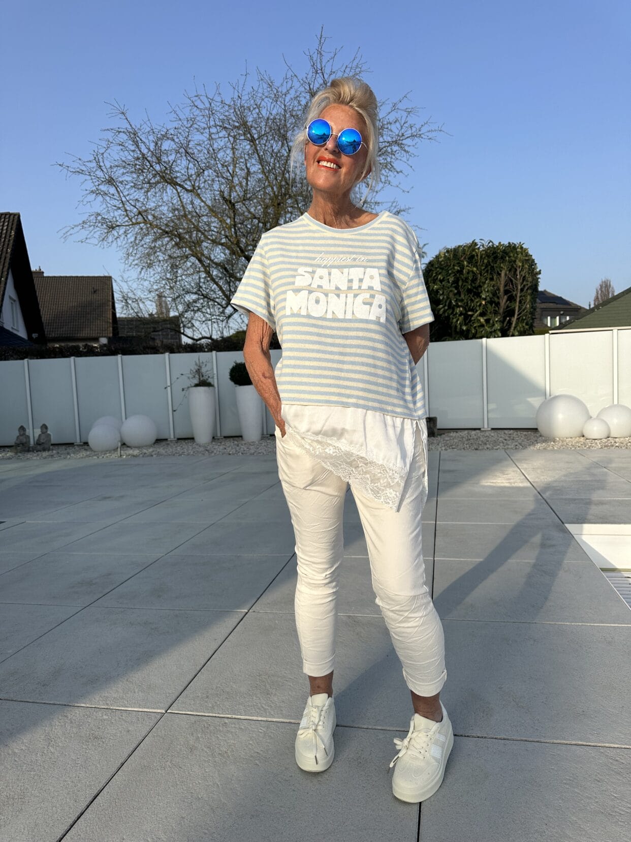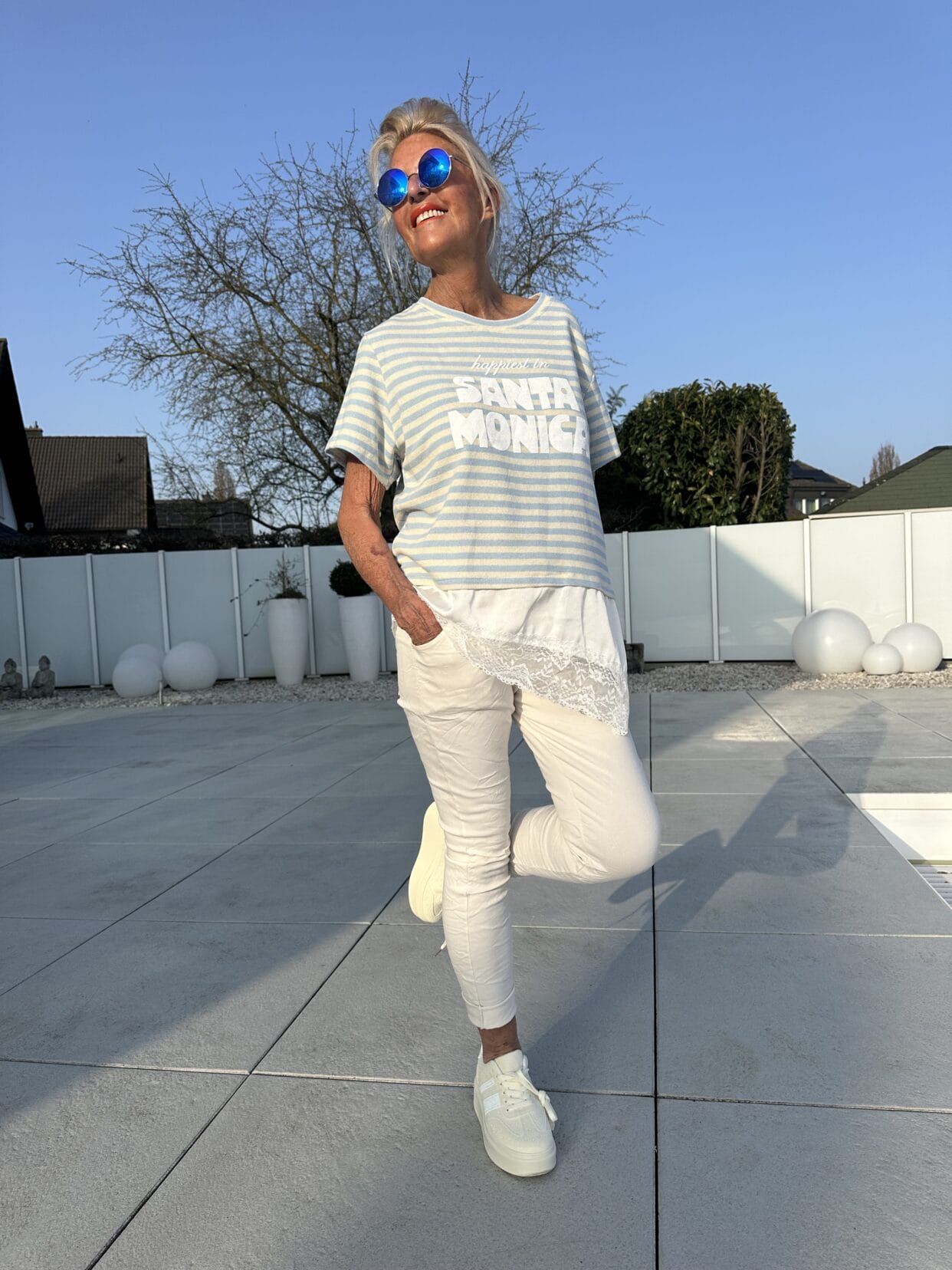 Lightweight short-sleeved striped sweater with fixed lace shirt extension and a text motif.