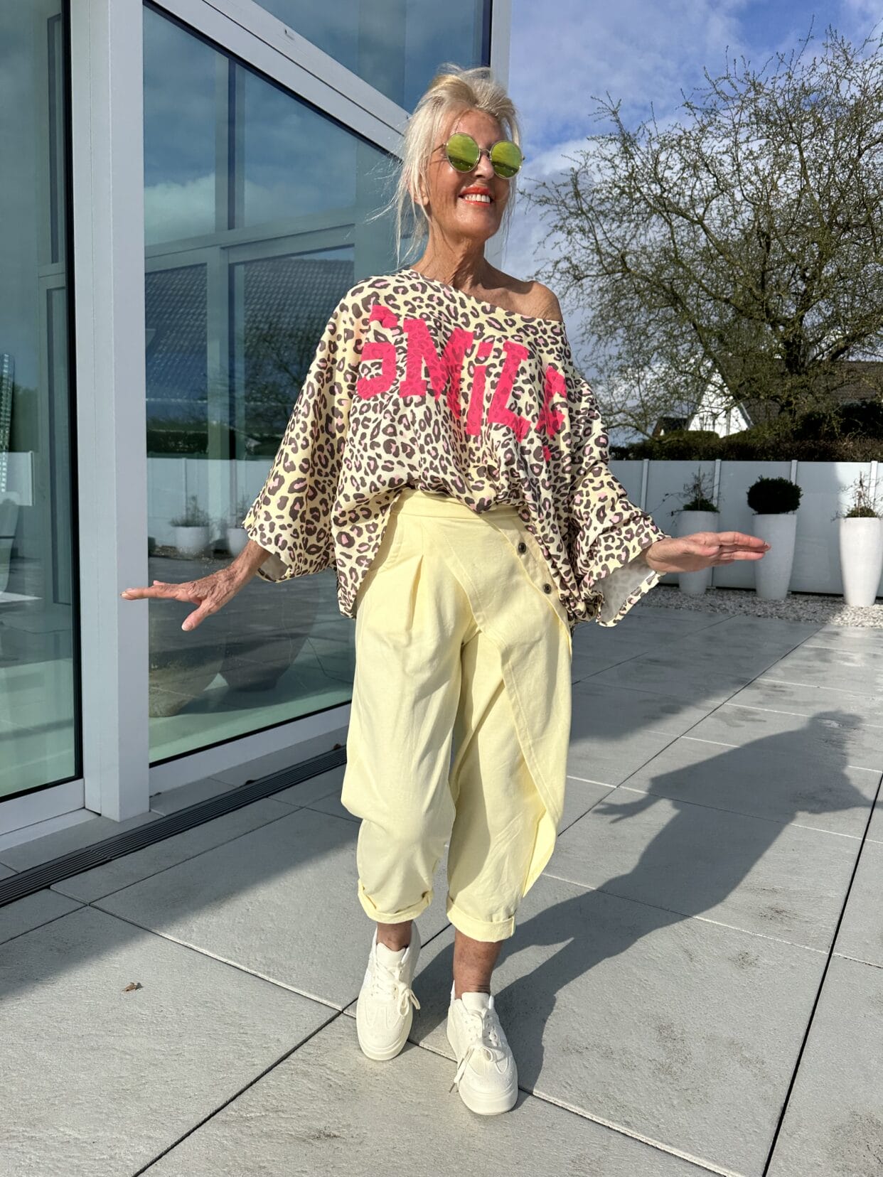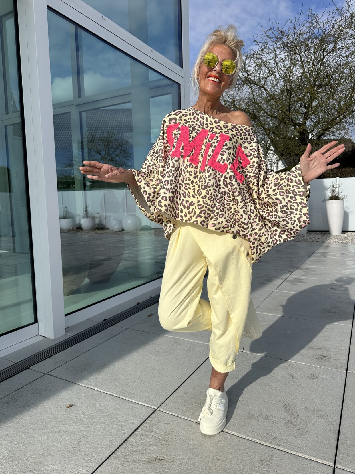Oversized shirt in a colorful animal style with a bright smiley face motif.