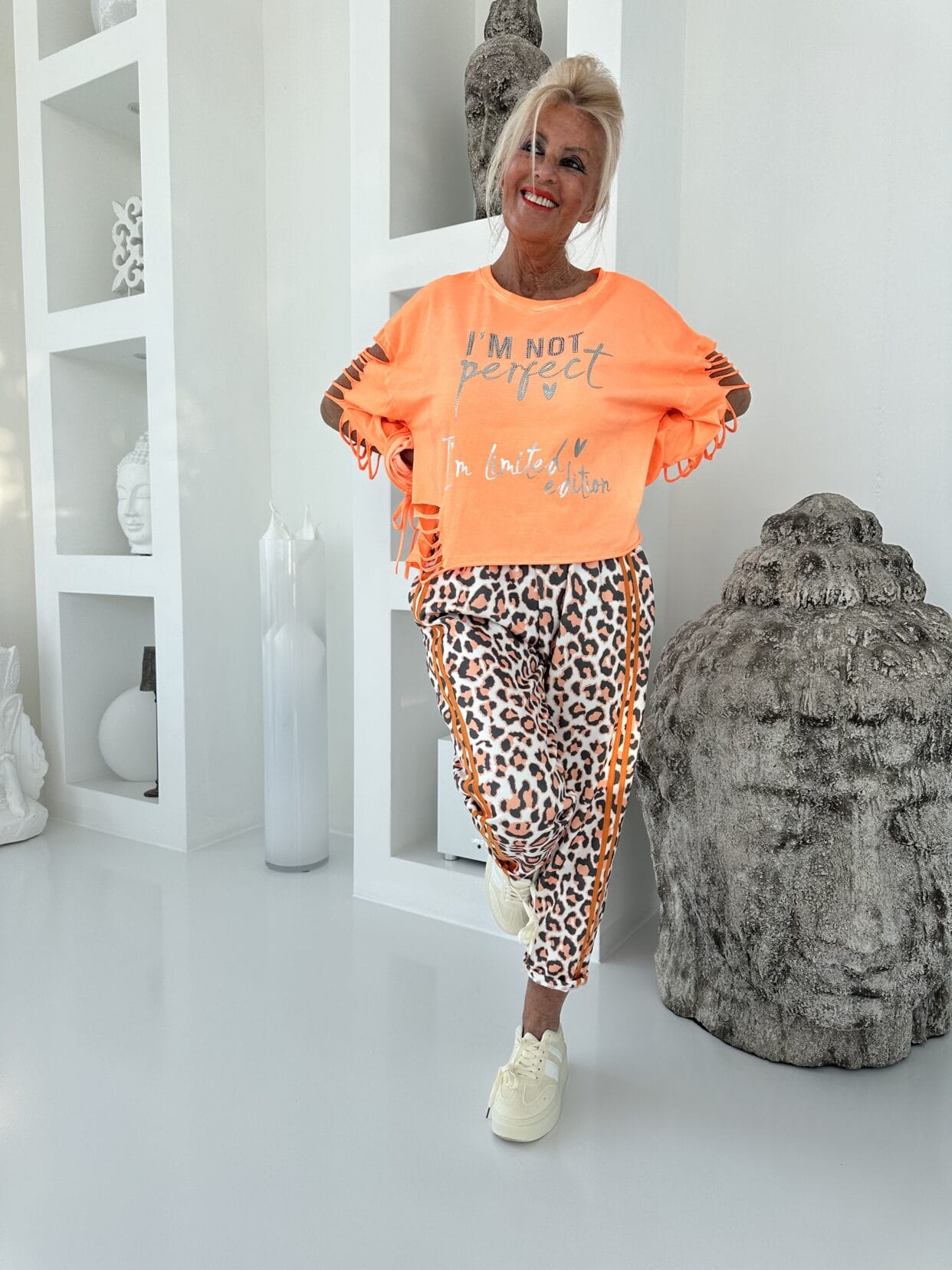 Lightweight two-piece suit in animal print with side stripes, consisting of a blazer and pull-on trousers.
