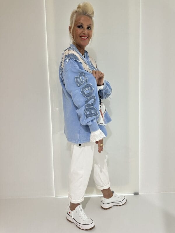 Blazer léger en 3 couleurs avec 4 bandes latérales sur les deux bras et 2 rabats de poche (fausses poches !), ainsi qu’un bouton scintillant.