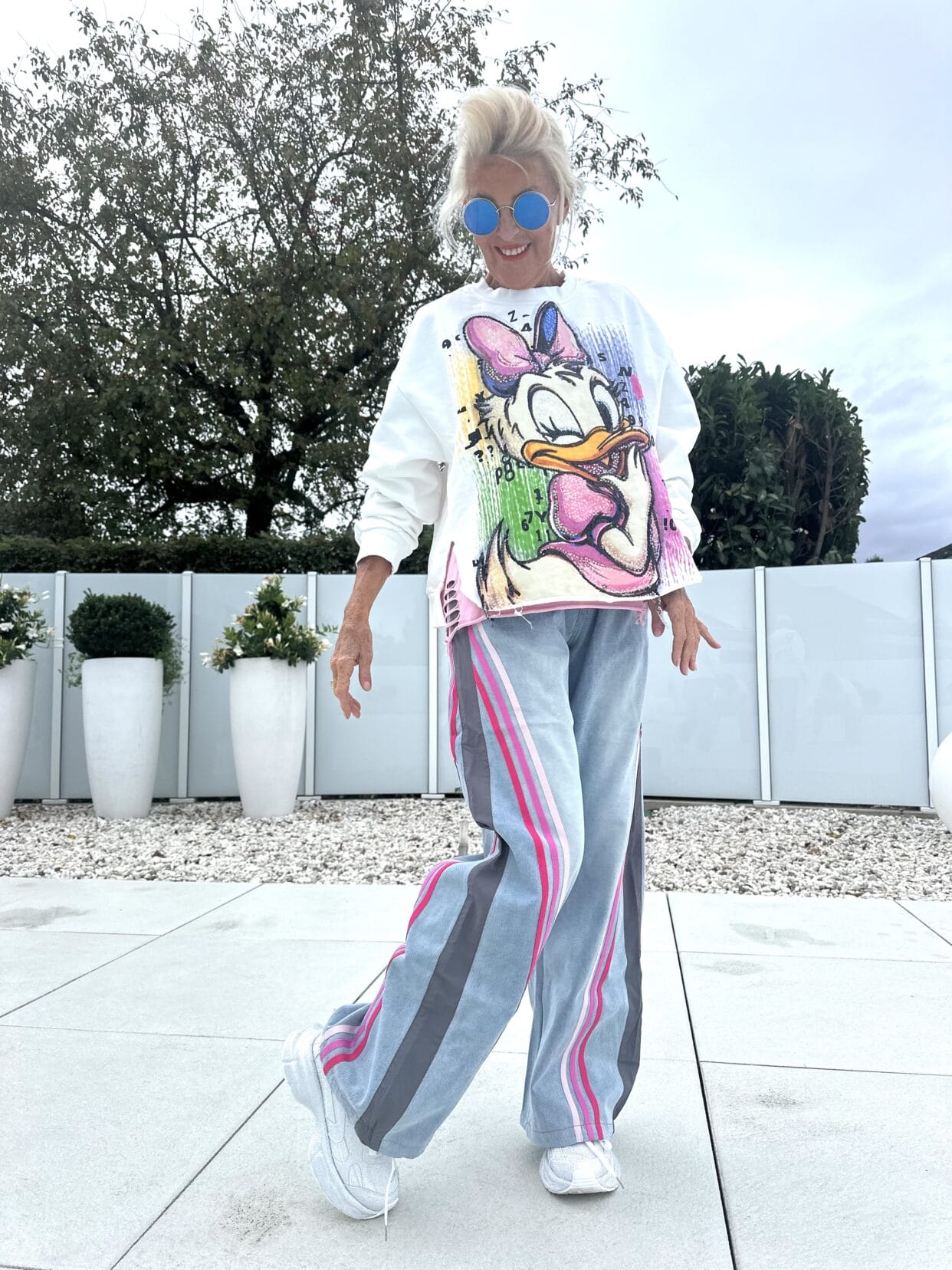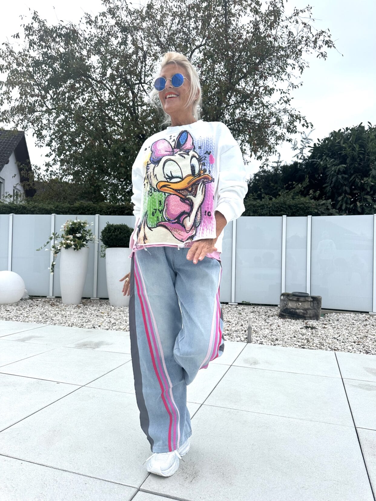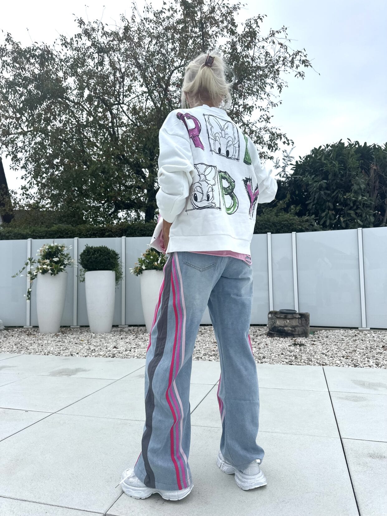 Ensemble deux pièces composé d’un pantalon large à enfiler avec bandes latérales et d’un pull style bande dessinée. Le pull est également disponible séparément en turquoise.