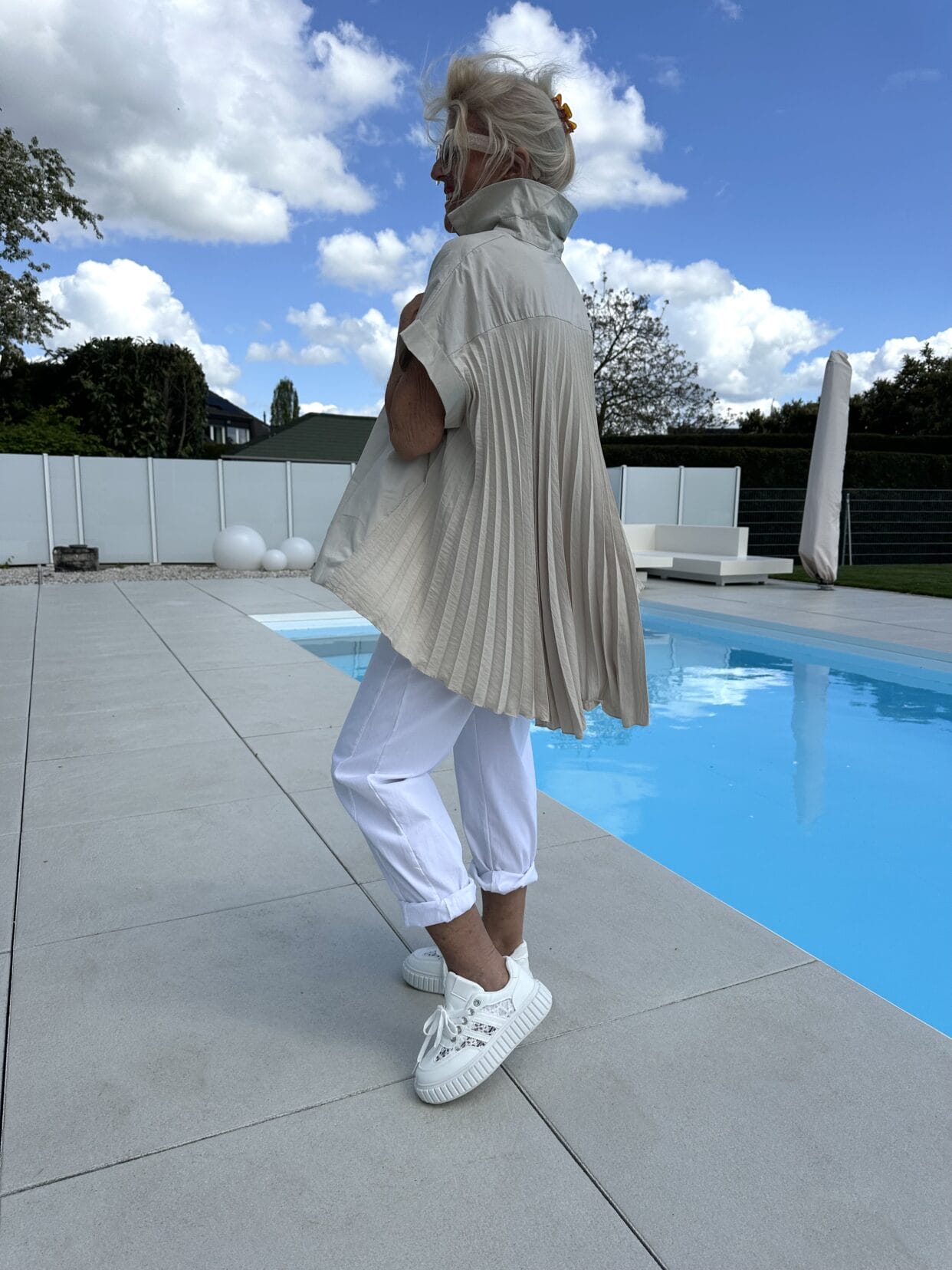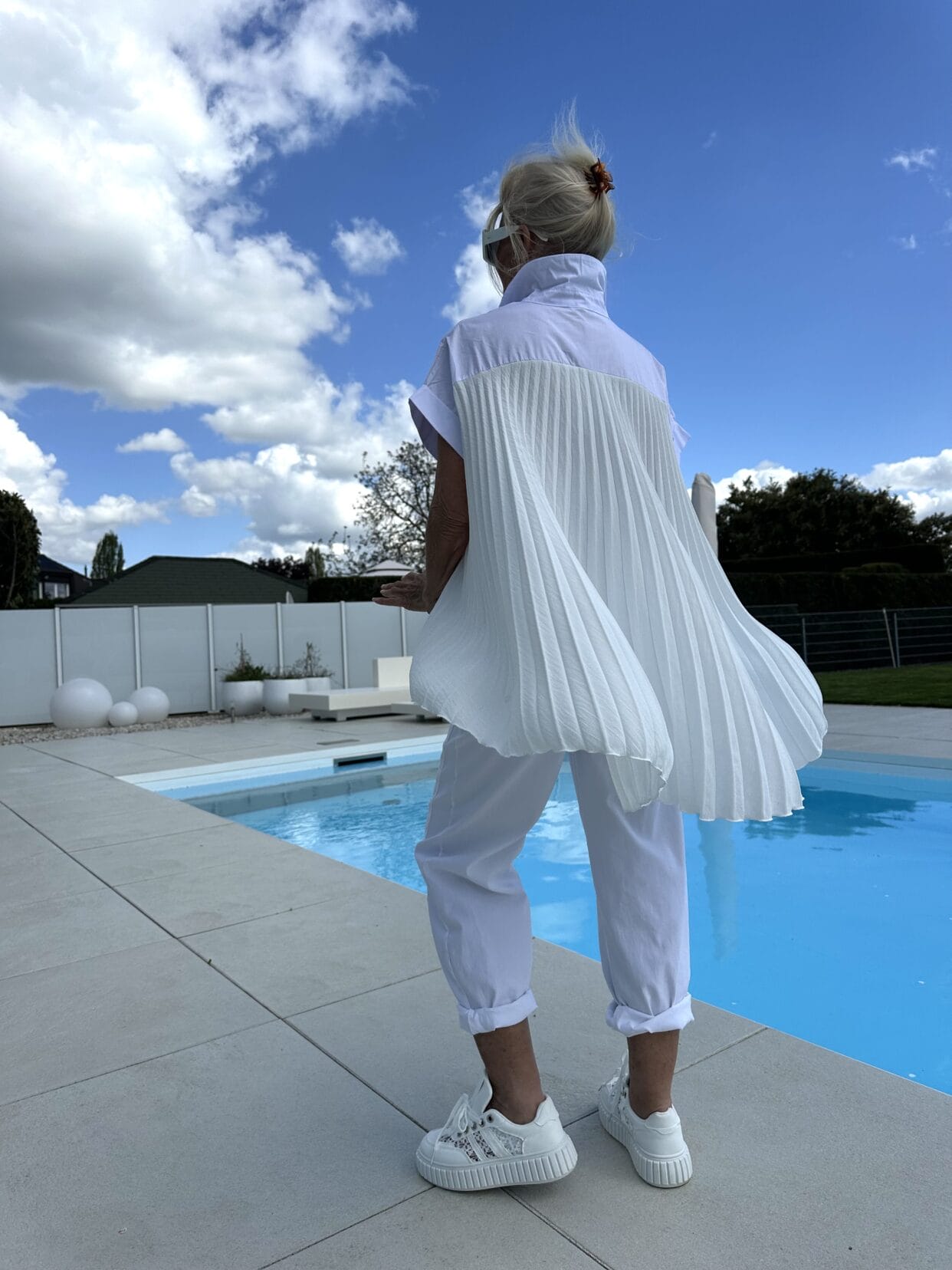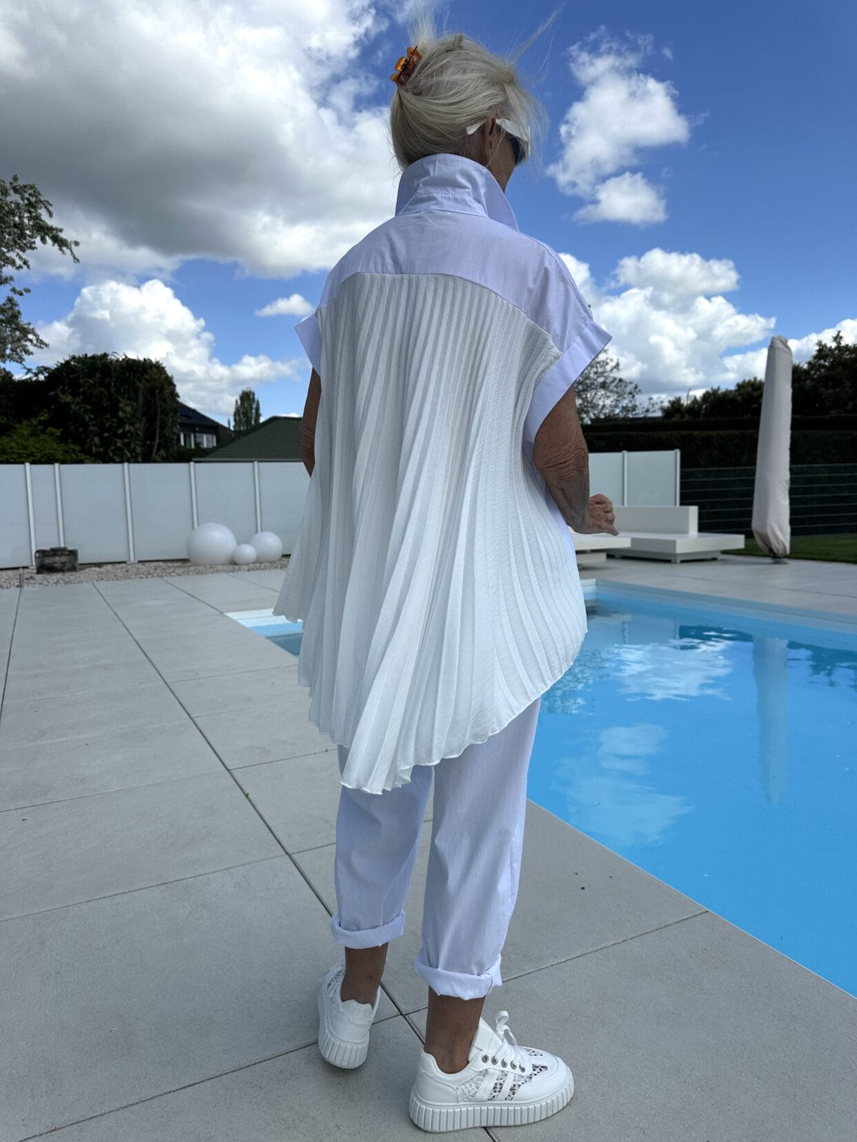 Blouse en coton à manches courtes avec plissé XL dans le dos, disponible en deux couleurs.