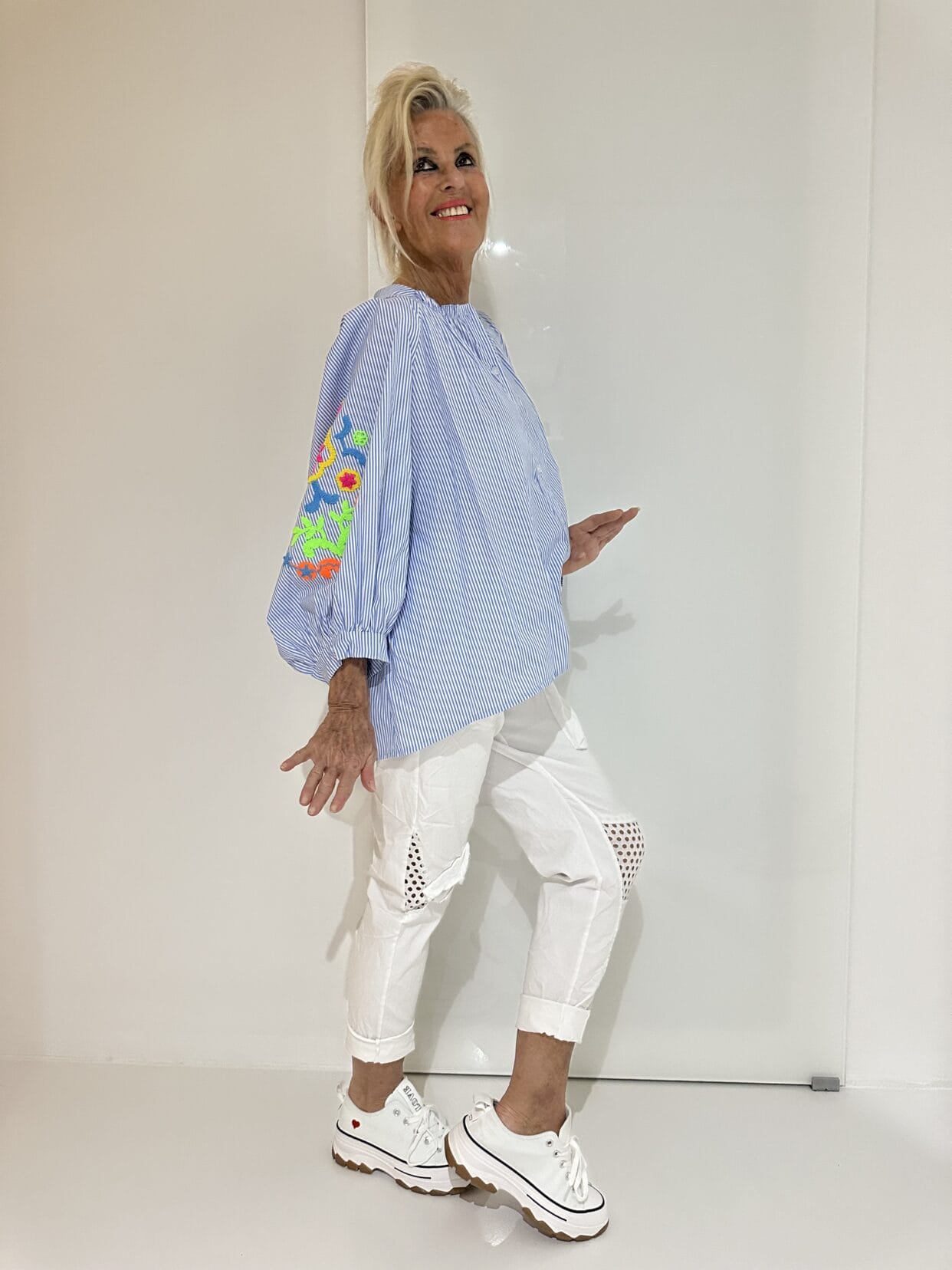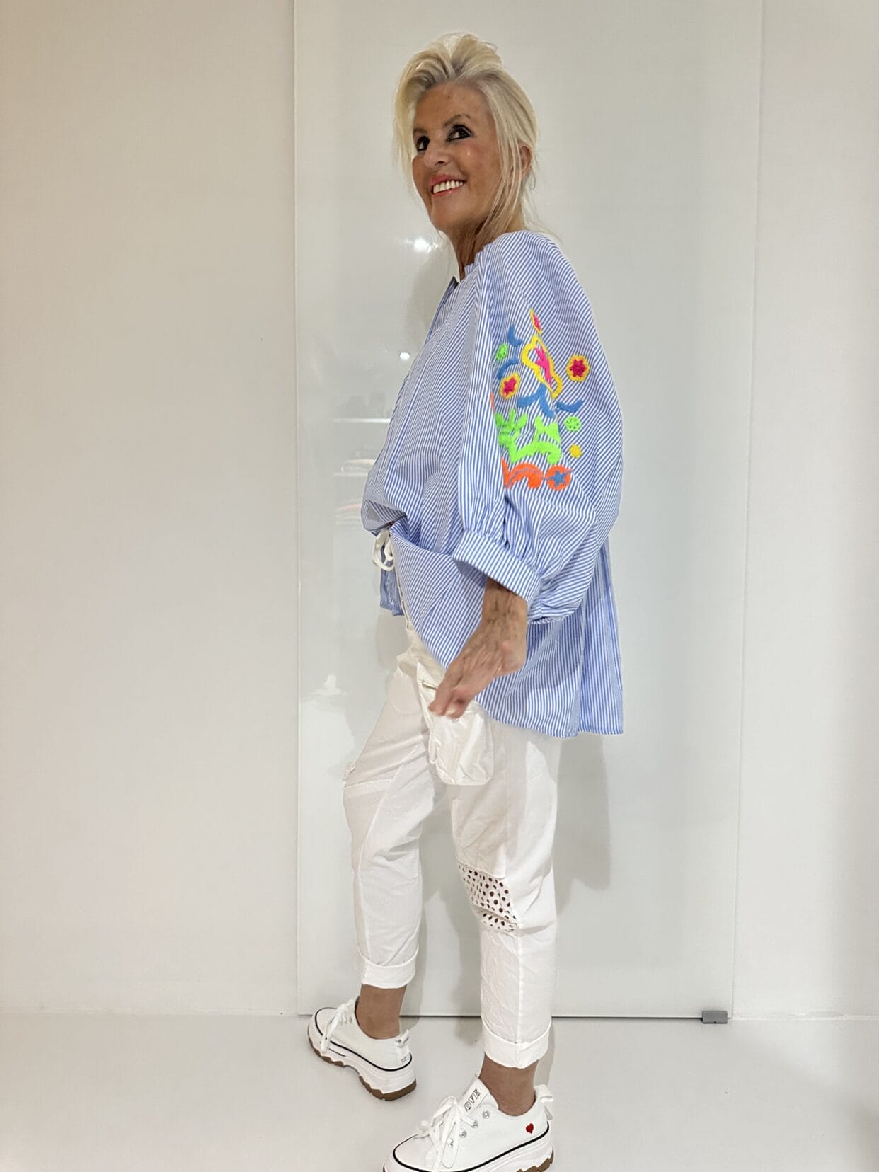 Chemisier en coton rayé bleu et blanc, à manches larges 3/4 et flocage coloré sur les bras.