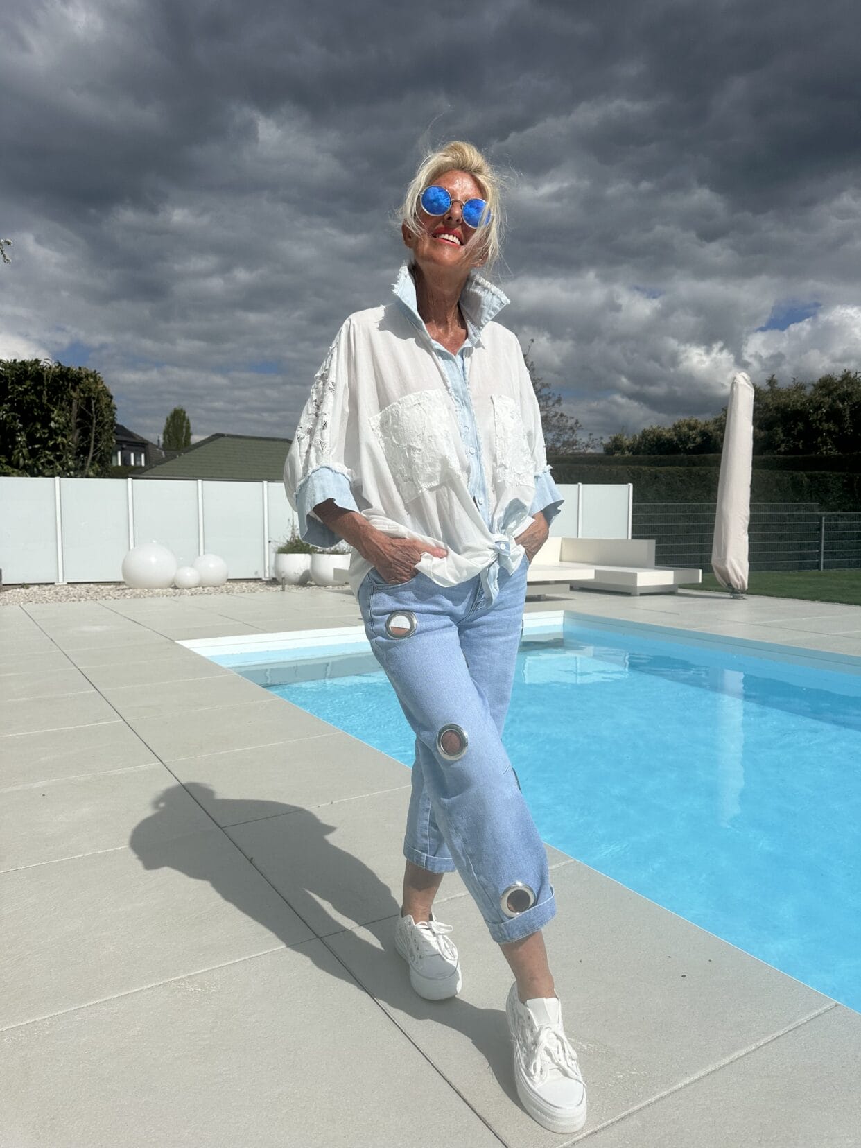 Blouse en coton blanc avec des éléments en jean frangés et des empiècements en dentelle sur les poches poitrine, les bras et le cou.