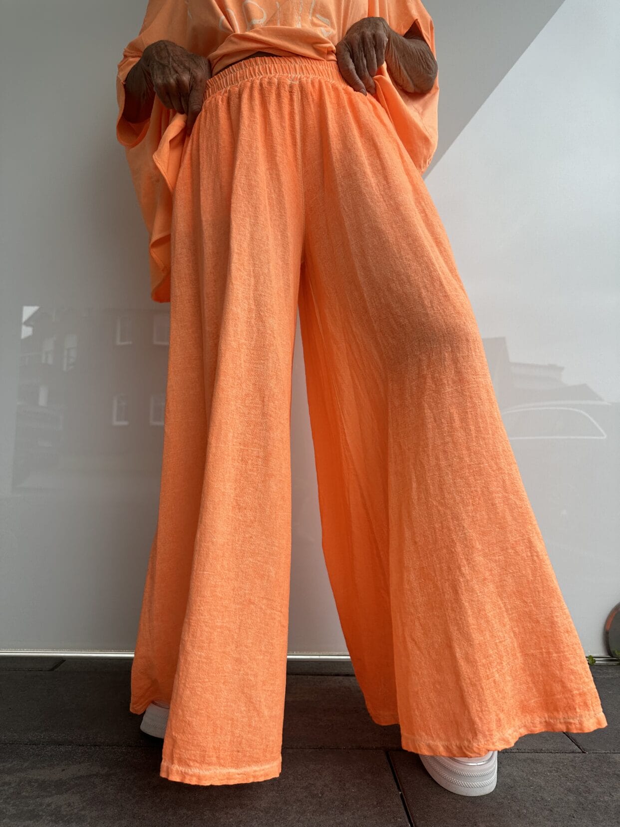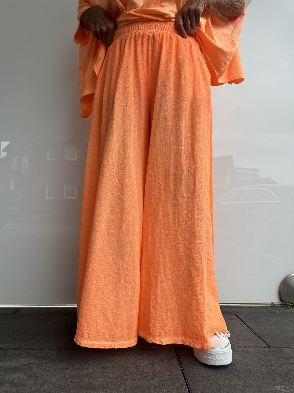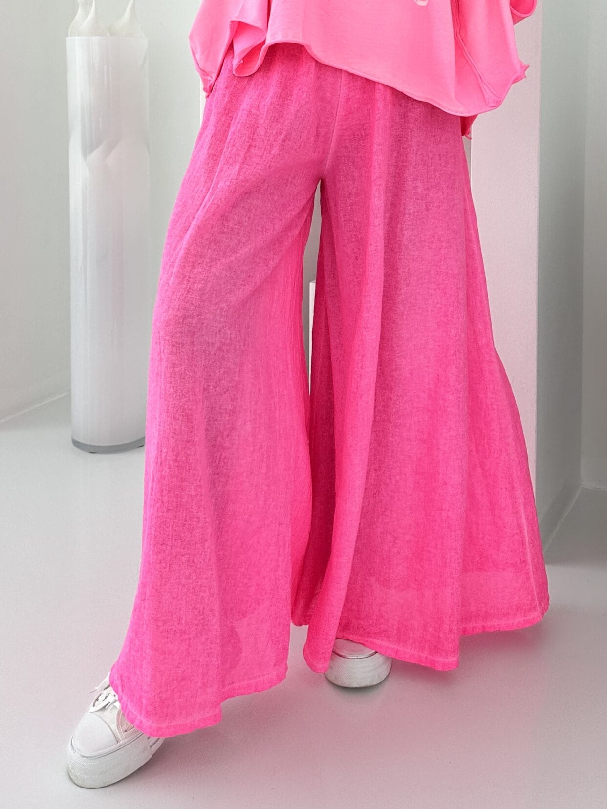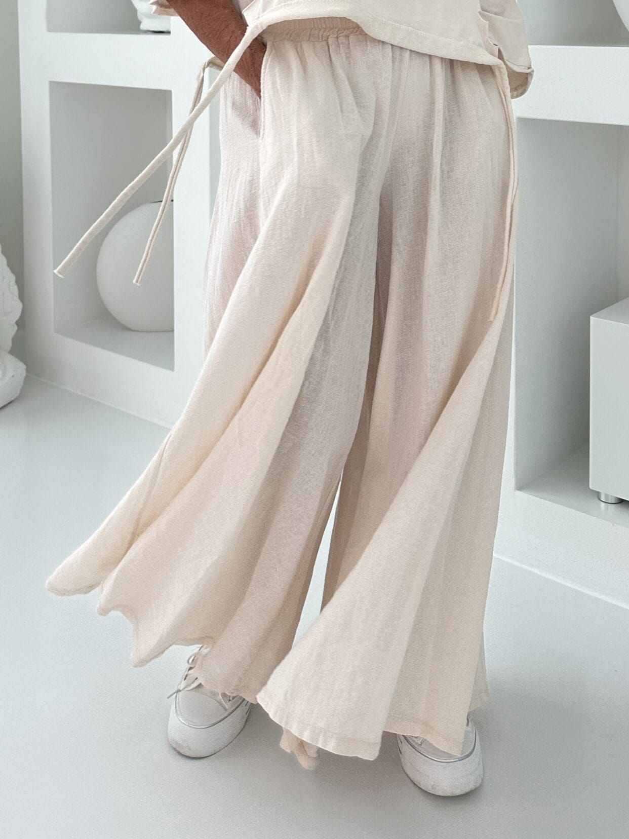 Pantalon en coton uni d’aspect lin, semblable à une jupe-culotte, disponible dans diverses couleurs estivales.