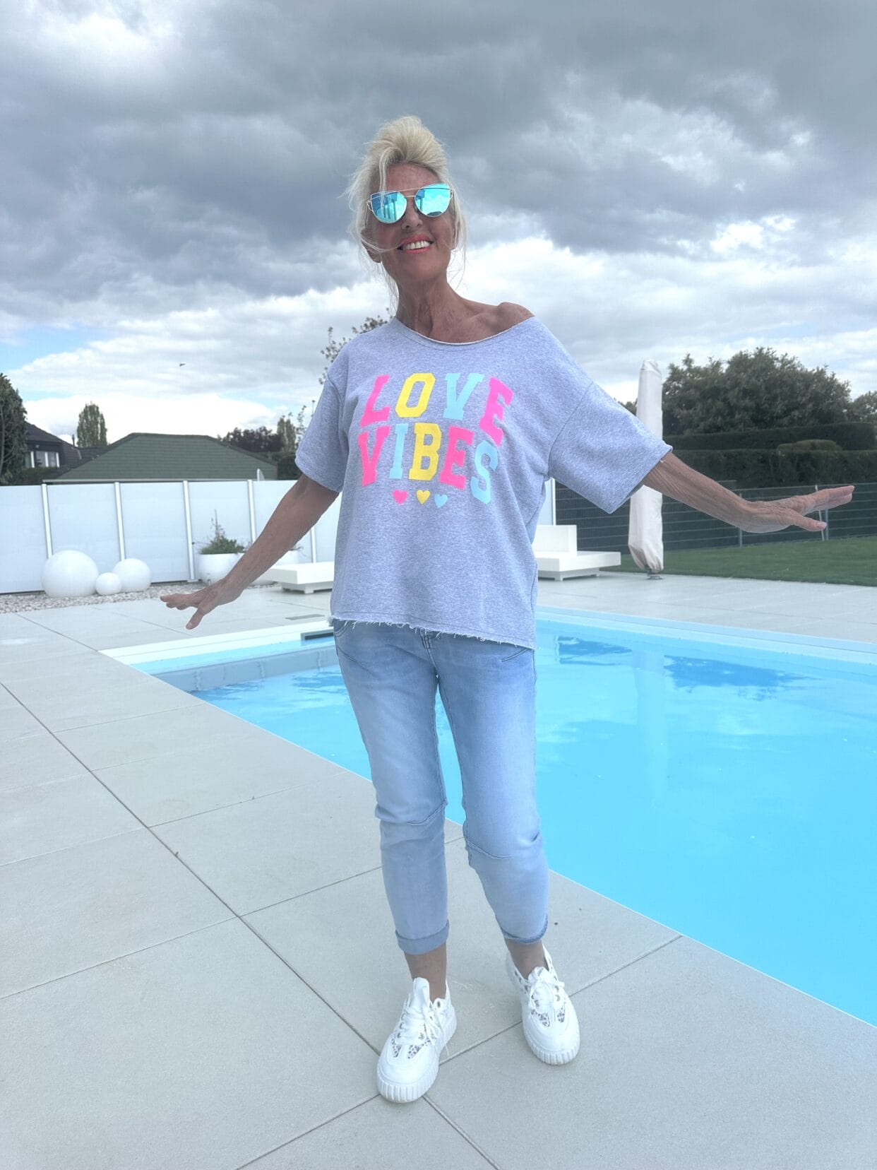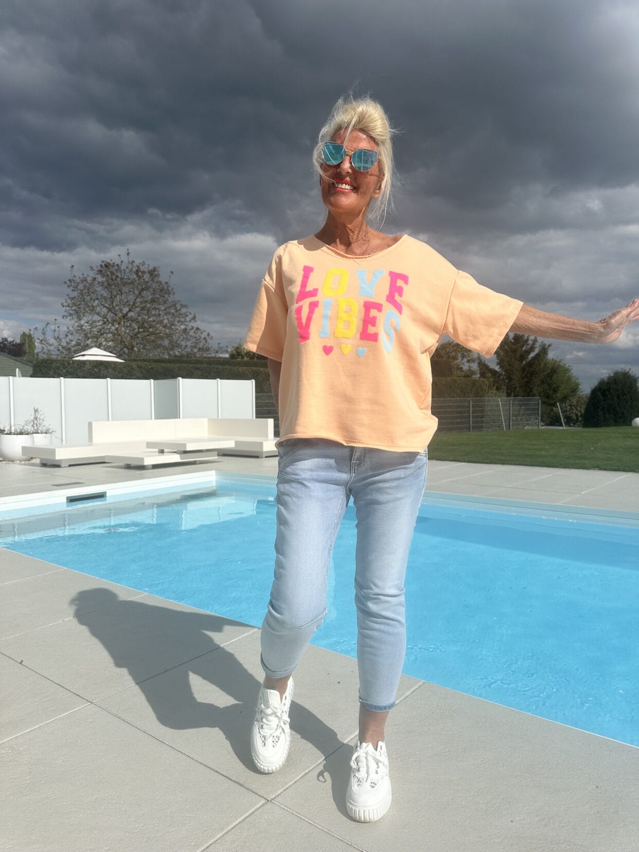 T-shirt uni à manches courtes en 2 couleurs avec un motif de texte éclatant ainsi que 3 cœurs de même couleur.