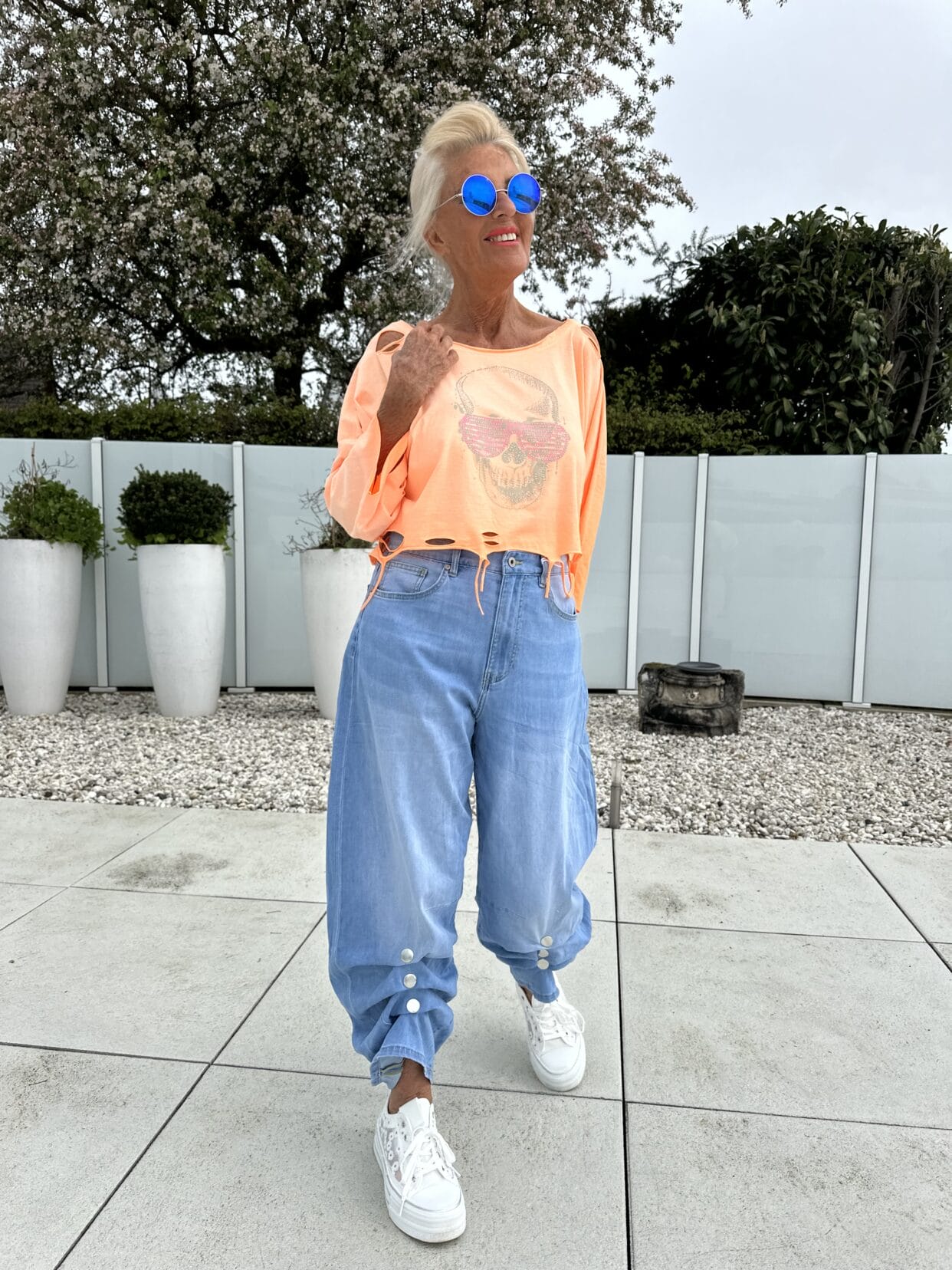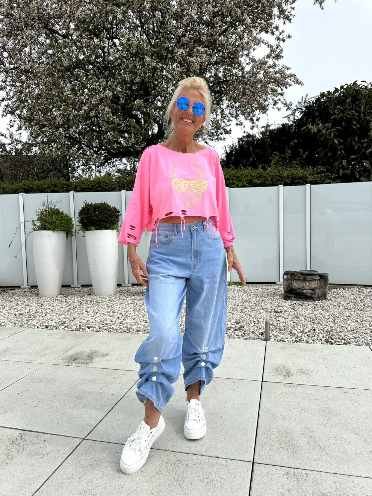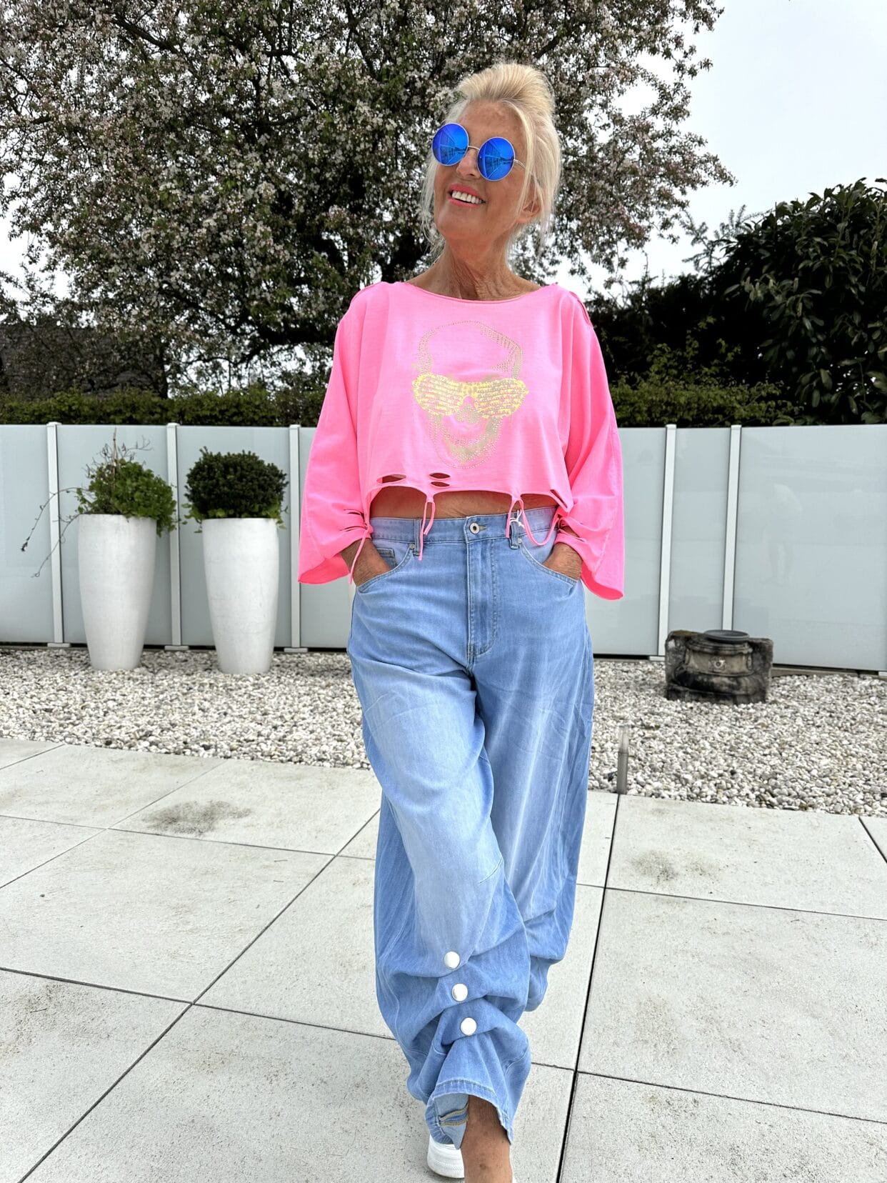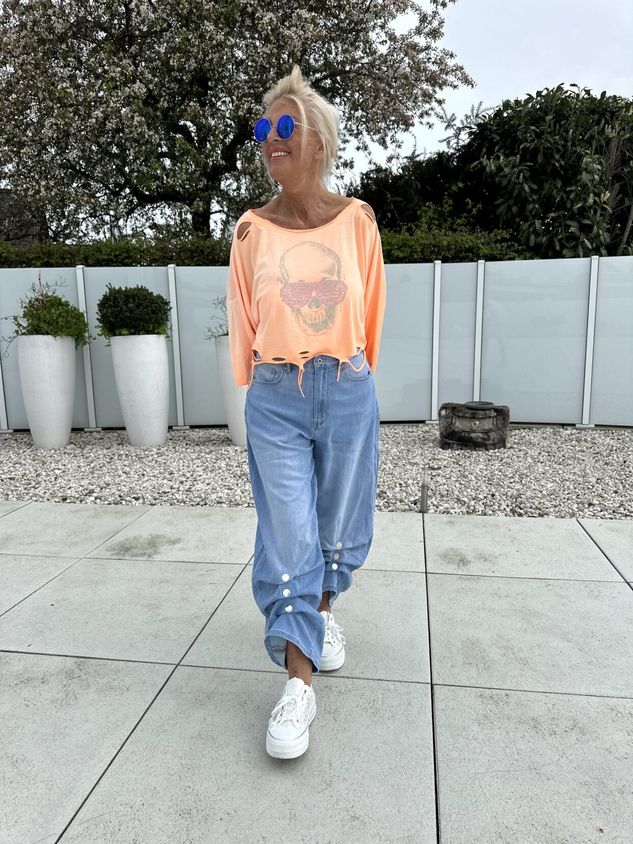 T-shirt usé à coupe courte en 2 couleurs vives avec motif skull scintillant.