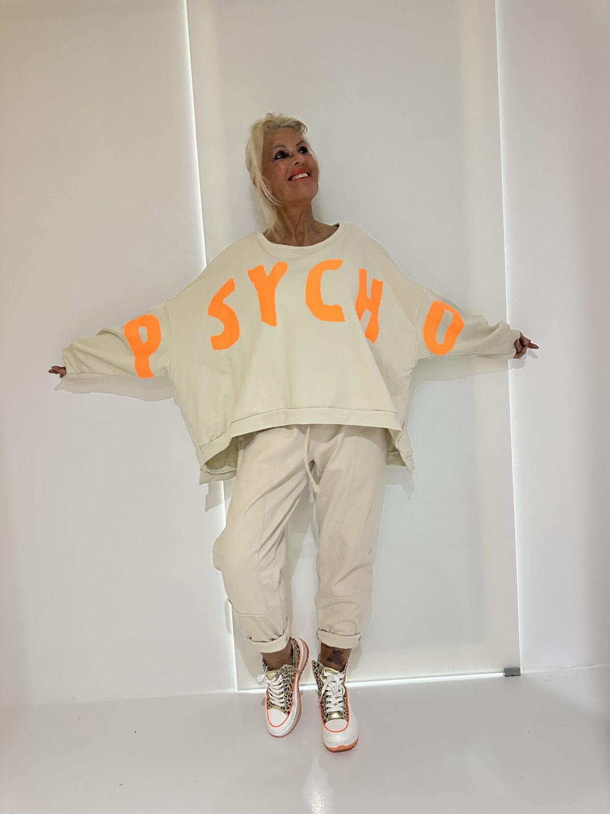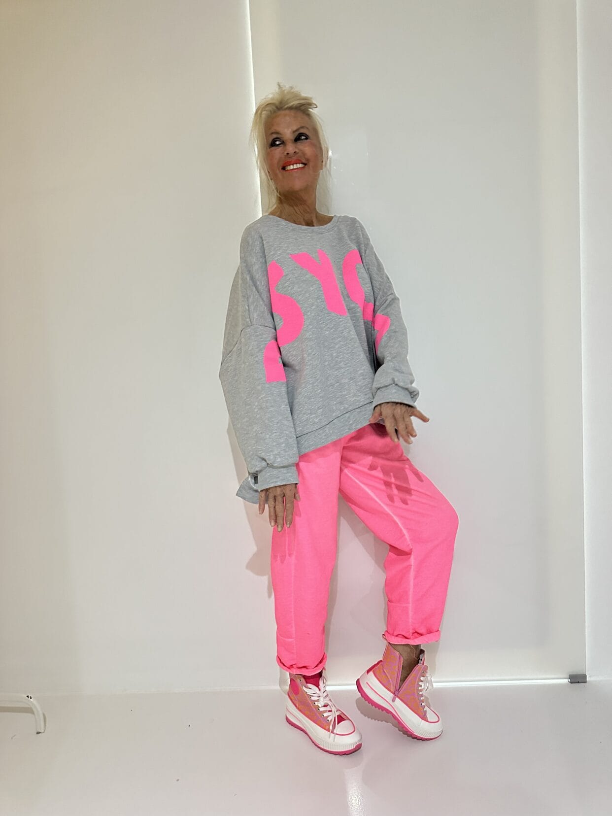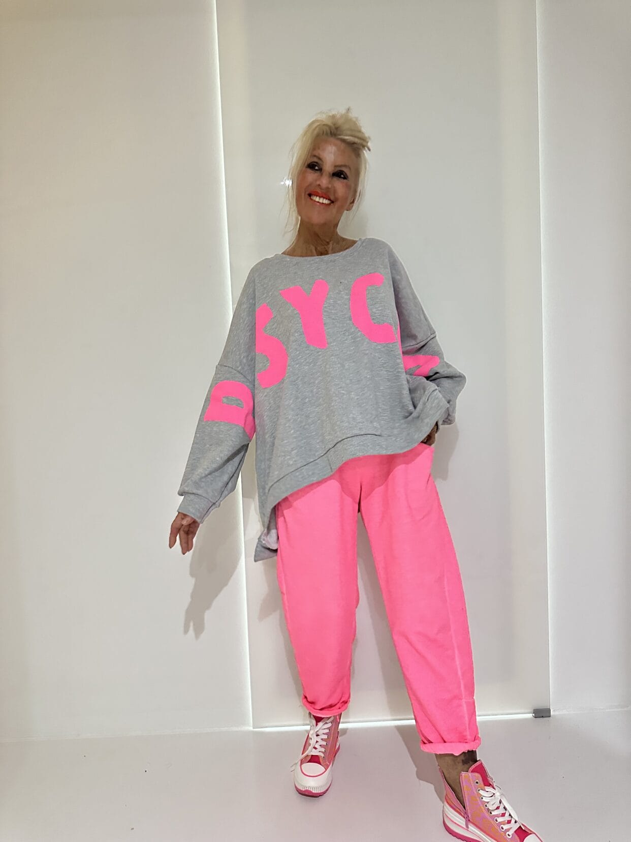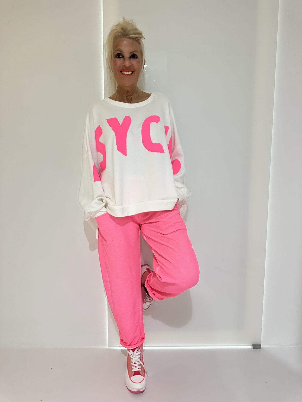 Pull léger et douillet orné d’un motif textuel éclatant en trois couleurs.