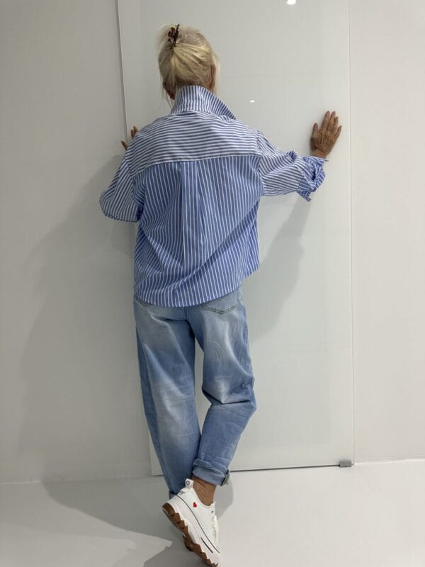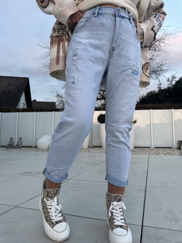 Hellblaue Used-Jeans die eine Nummer größer ausfällt.
