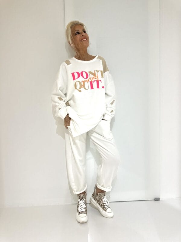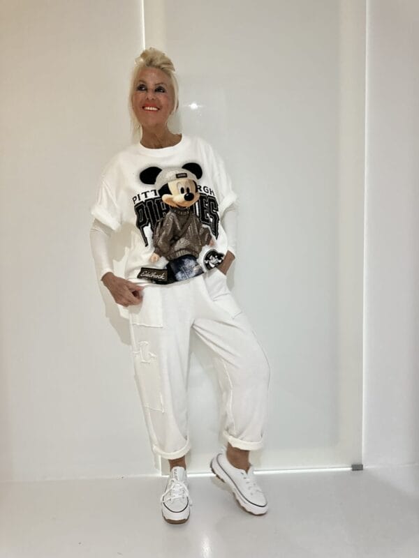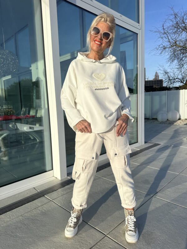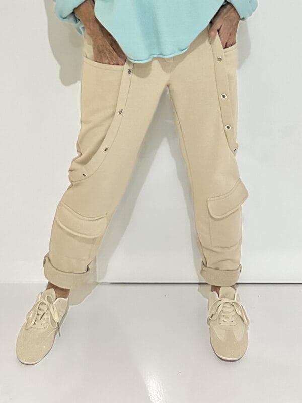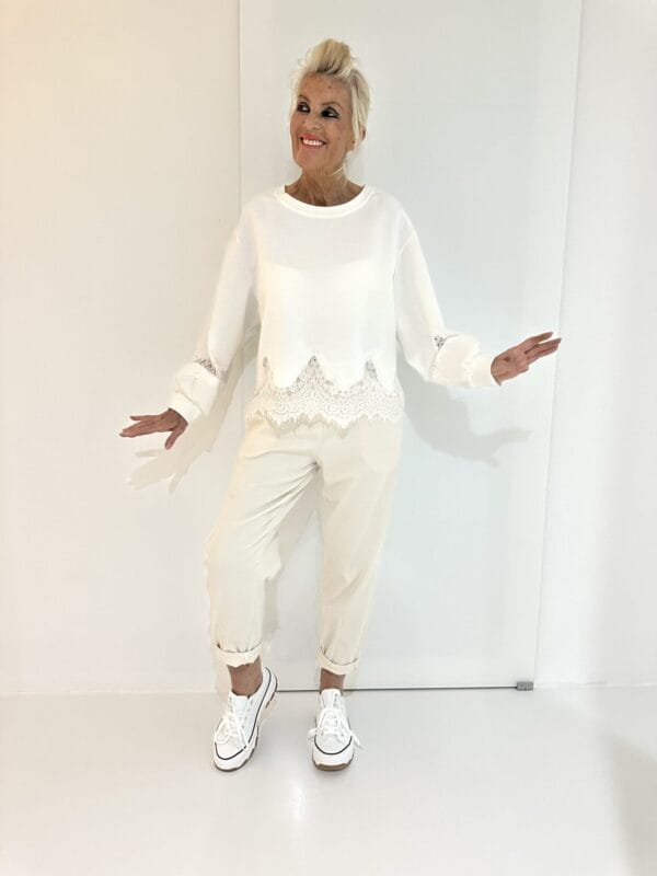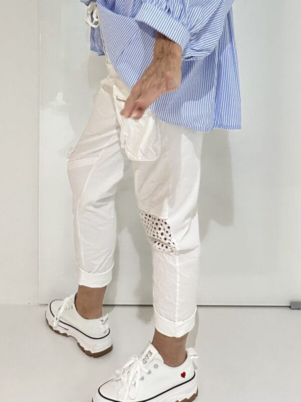 Weiße Schlupfhose mit zwei Ösenreihen und zwei Taschen unter dem Knie.