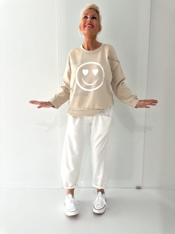 Leichtes Langarmshirt mit Smiley-Motiv, Glitzer-Amore und Fake-Reißverschlüssen in drei Farben.