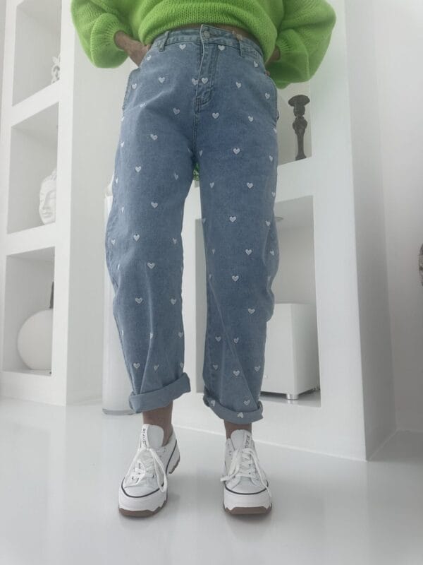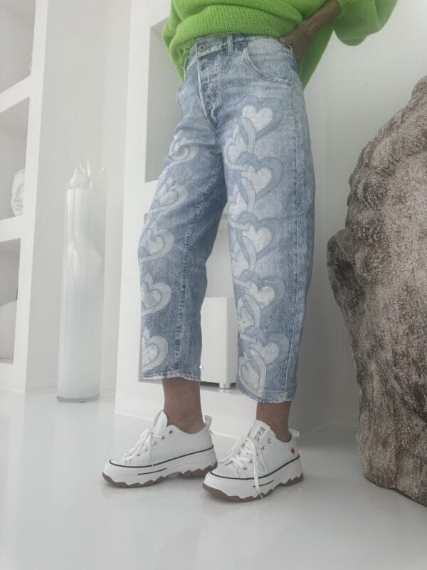 Hellblaue, ausgewaschene Jeans mit weitem Bein und großen, verschachtelten Herz-Motiven.