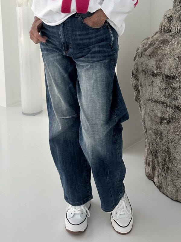 Dunkelblaue, ausgewaschene Jeans (fällt normal aus) im Clean-Style mit weitem Bein.