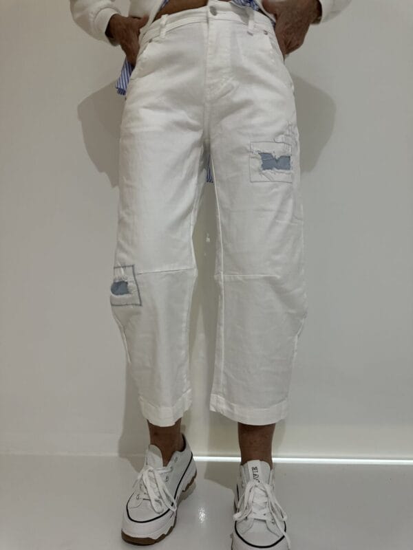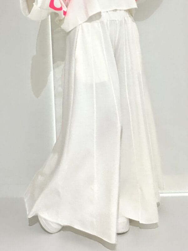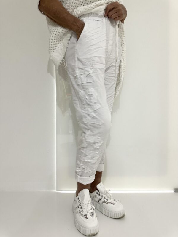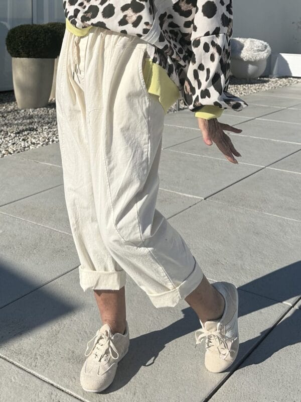 Weiße Schlupfhose mit weitem Bein und Tunnelzug im Bund.