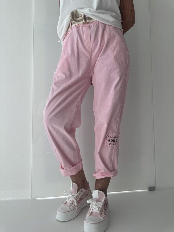 Schlupfhose mit Tunnelzug im Bund und einem seitlich aufgenähten Ton-in-Ton-Schriftzug.