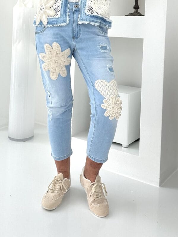 Hellblaue Jeanshose mit aufgesetzten Blüten inklusive jeweils einer Perle.