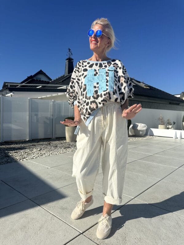 Oversize-Sweater im Animal-Style mit gedoppelten Nähten und seitlichen Schlitzen mit Hi-Motiv in zwei Farbstyles.