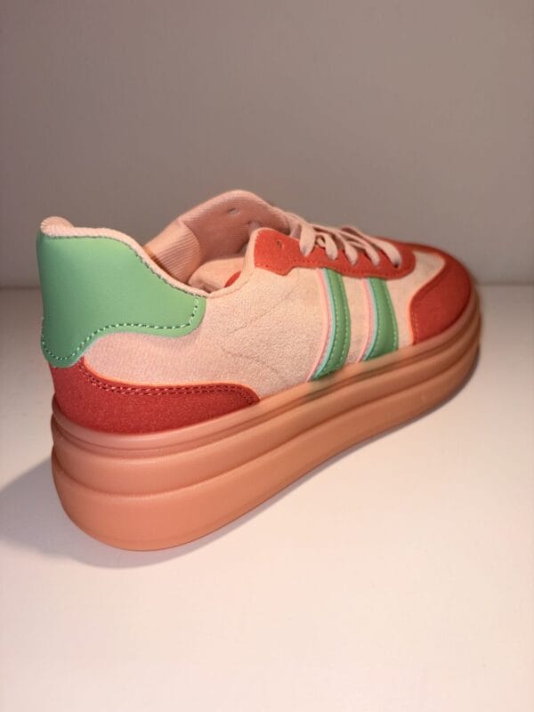 Orangefarbener, abgerundeter Sneaker mit seitlichen Streifen.