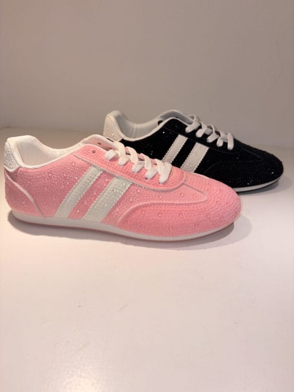 Rosefarbener Glitzer-Sneaker mit seitlichen Streifen.