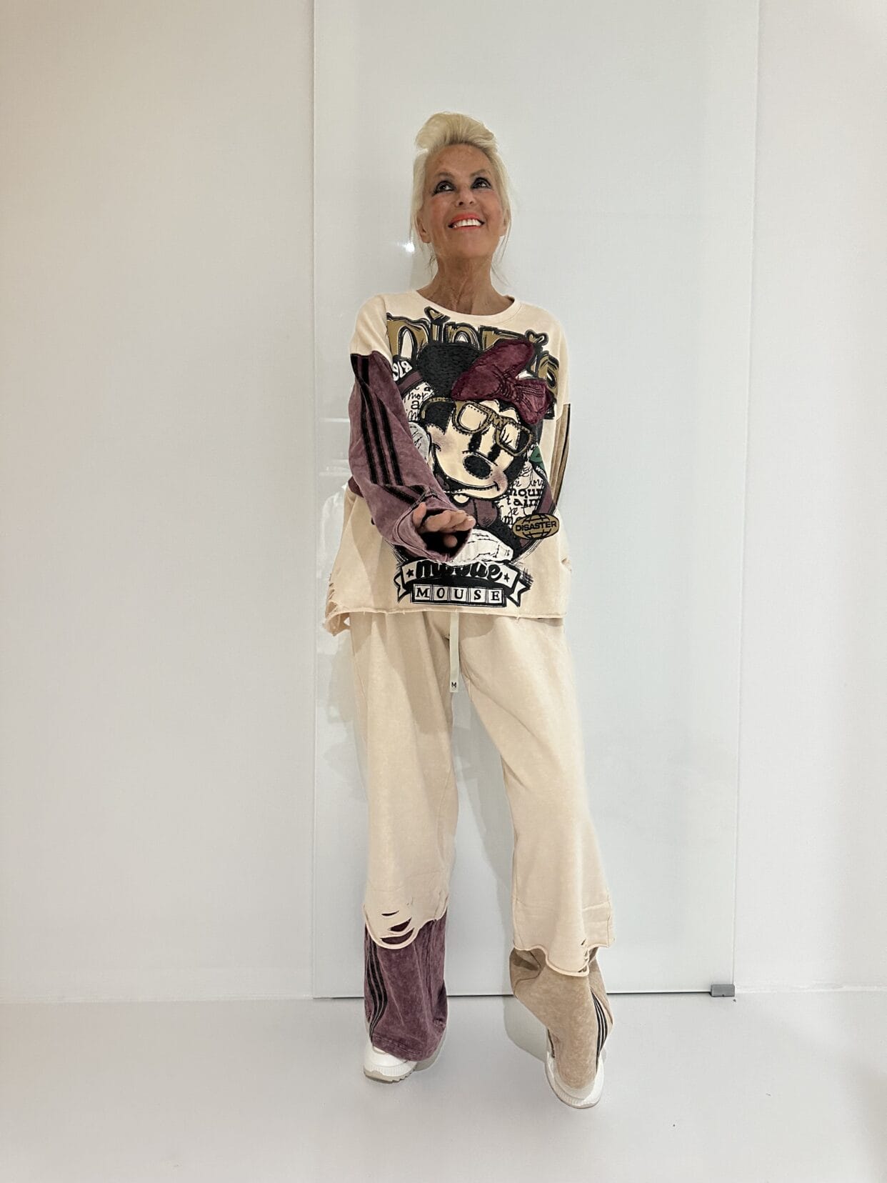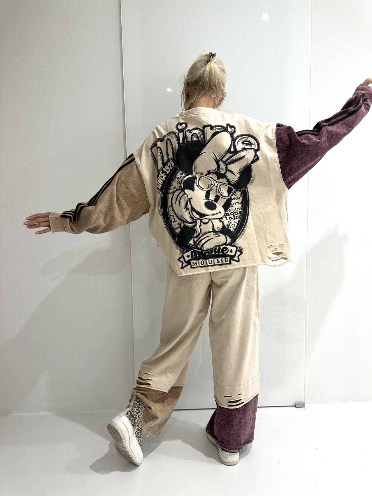 Camelfarbener, sportlich-modischer Zweiteiler im Comic-Style mit bordeaux-farbenen Akzenten und Used-Anteilen.