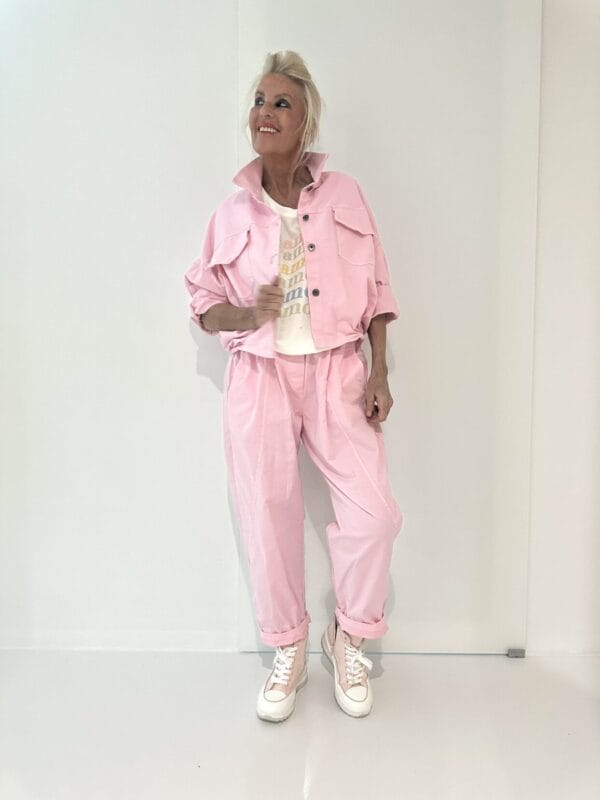 Leichter Zweiteiler bestehend aus einer kurzen Blouson-Jacke und einer Schlupfhose in frischen Frühlingsfarben.