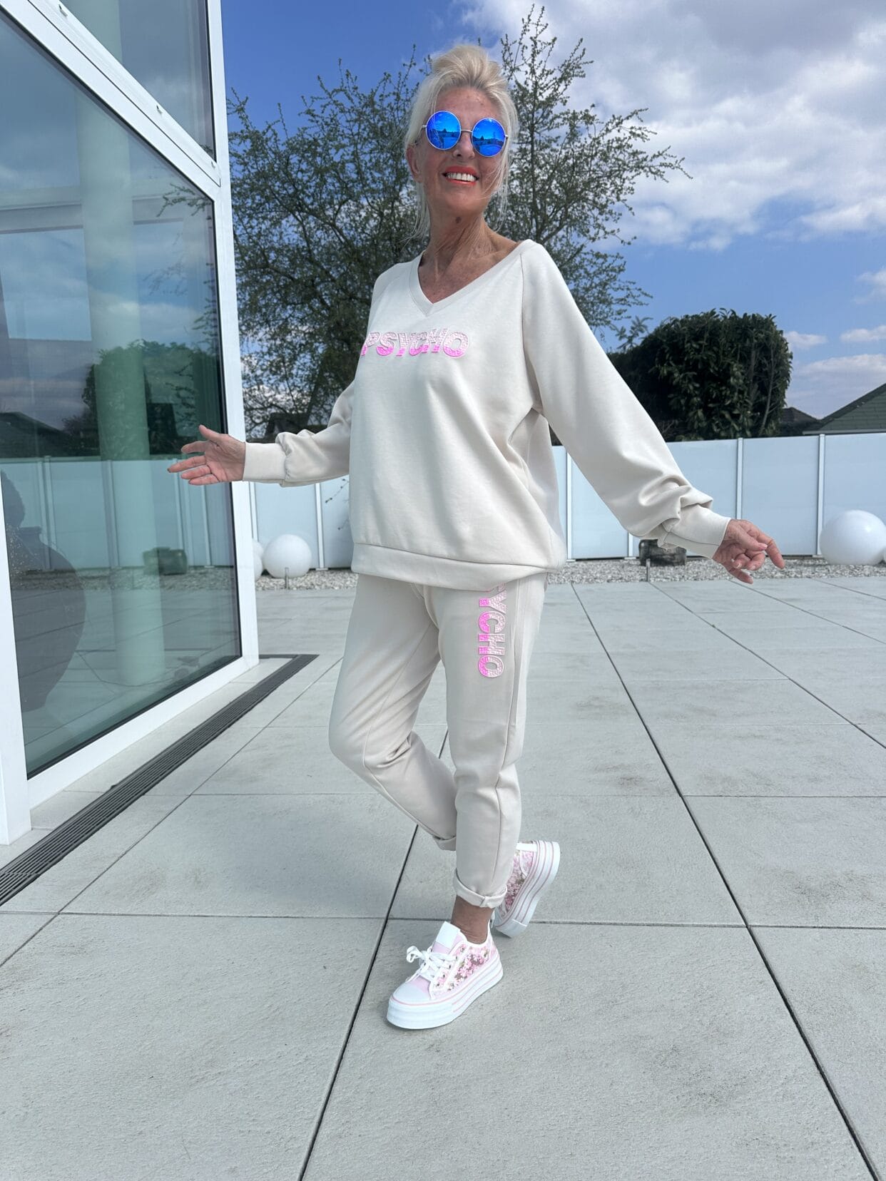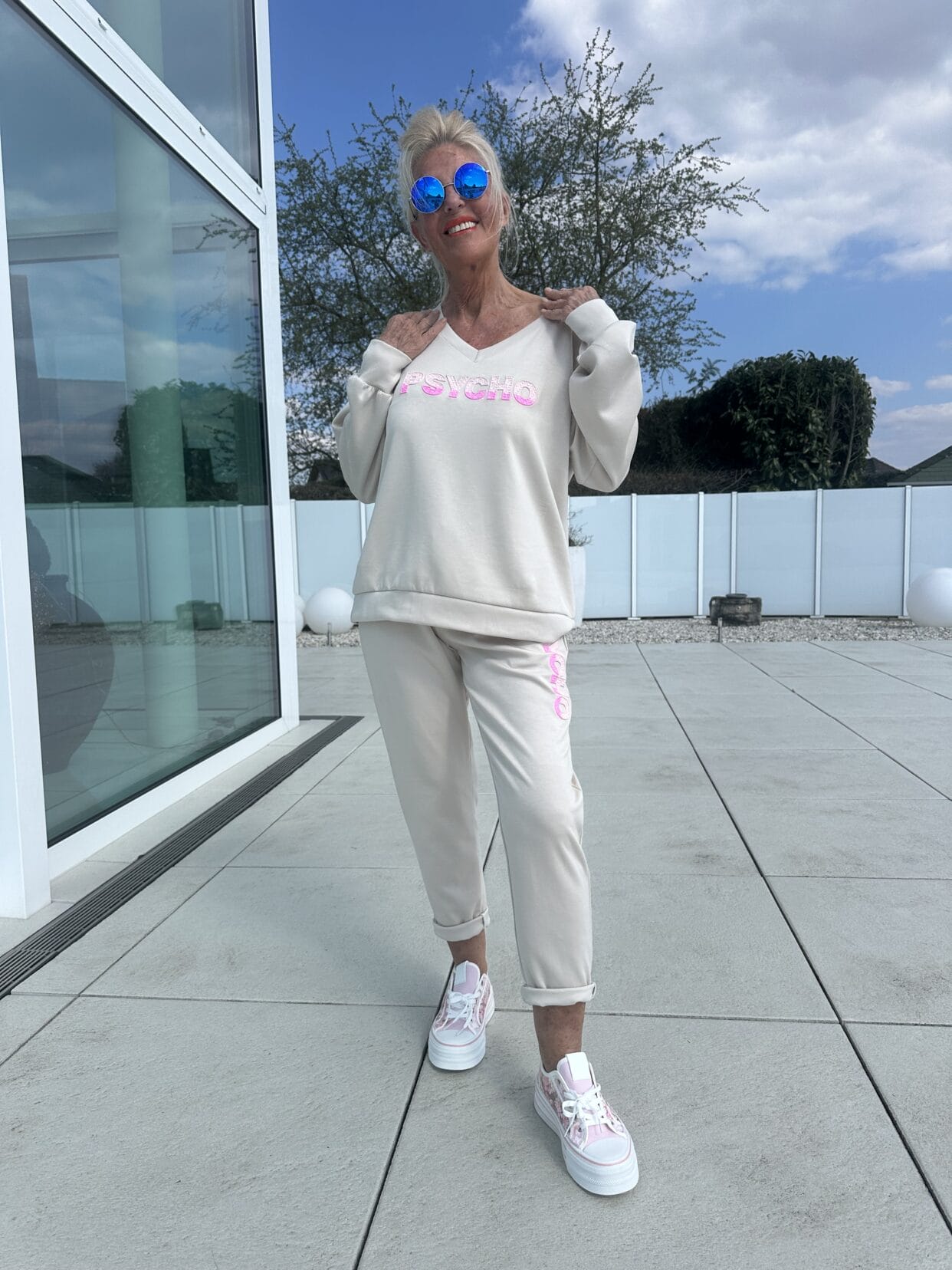 Leichter Zweiteiler in zwei Farben mit pink-rosa Psycho-Motiv.
