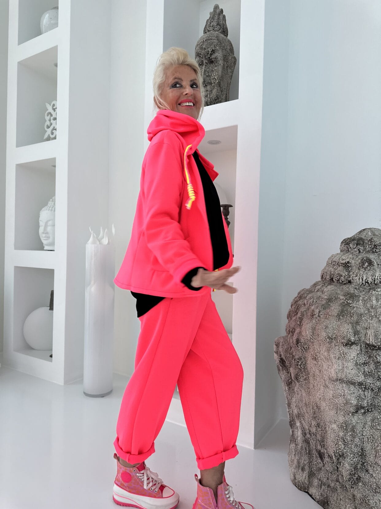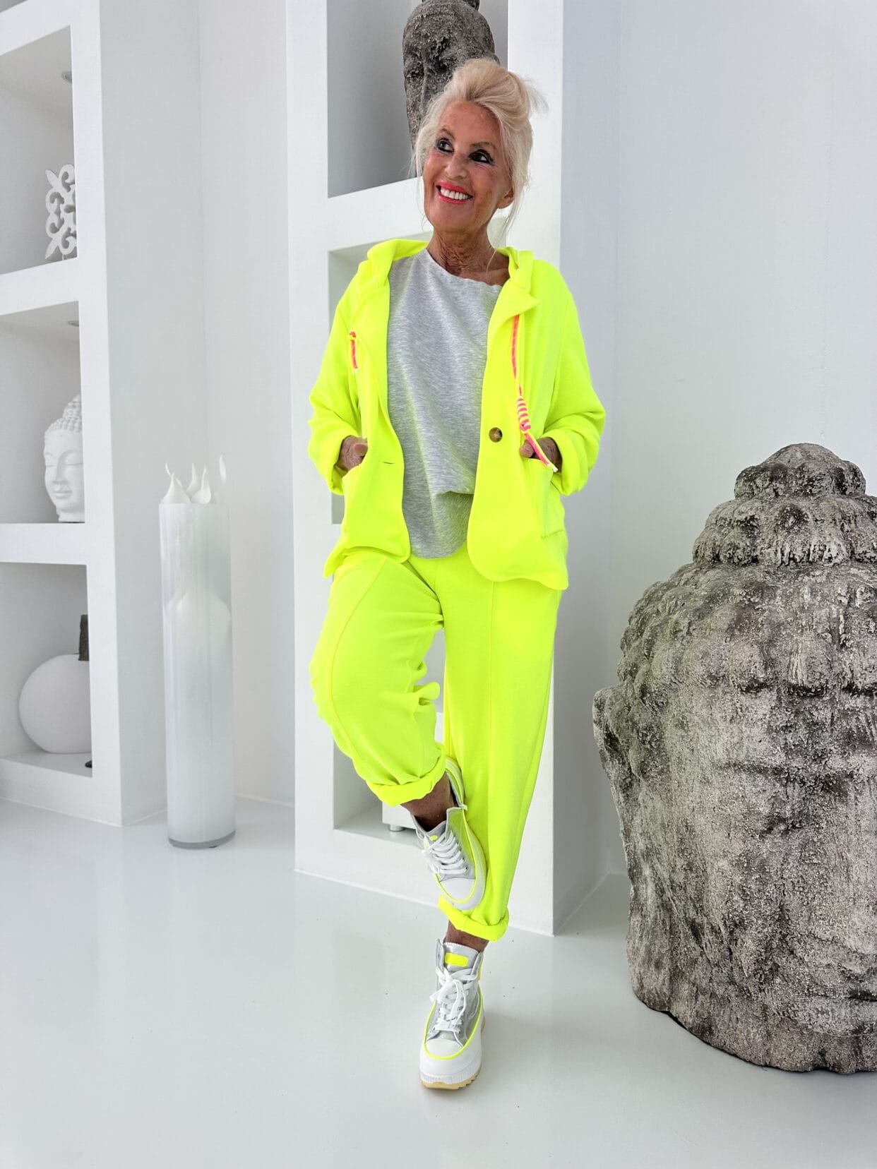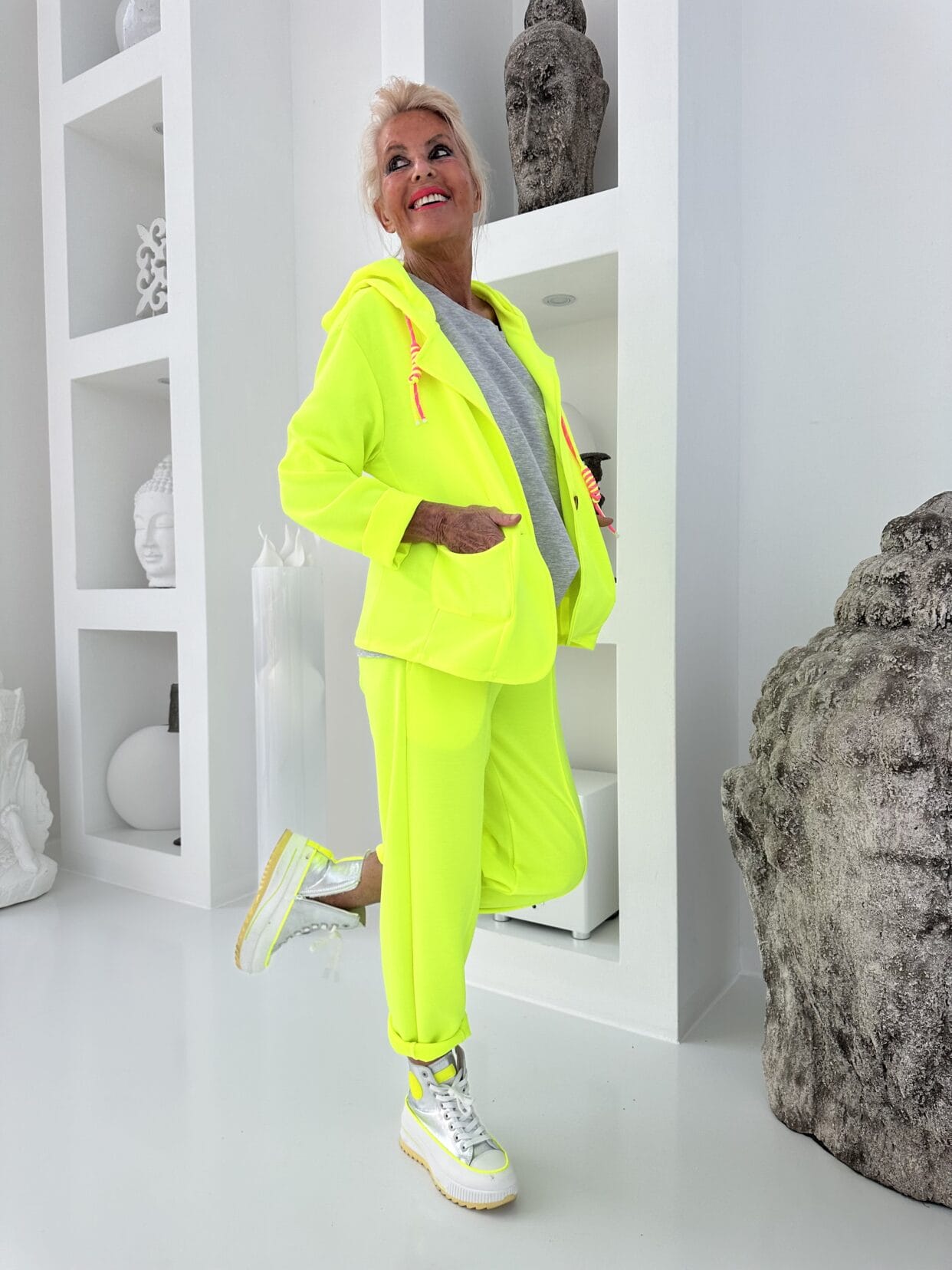 Leichter Kapuzenblazer in 3 Neonfarben mit zwei knalligen Tunnelzugbändern in der Kapuze.