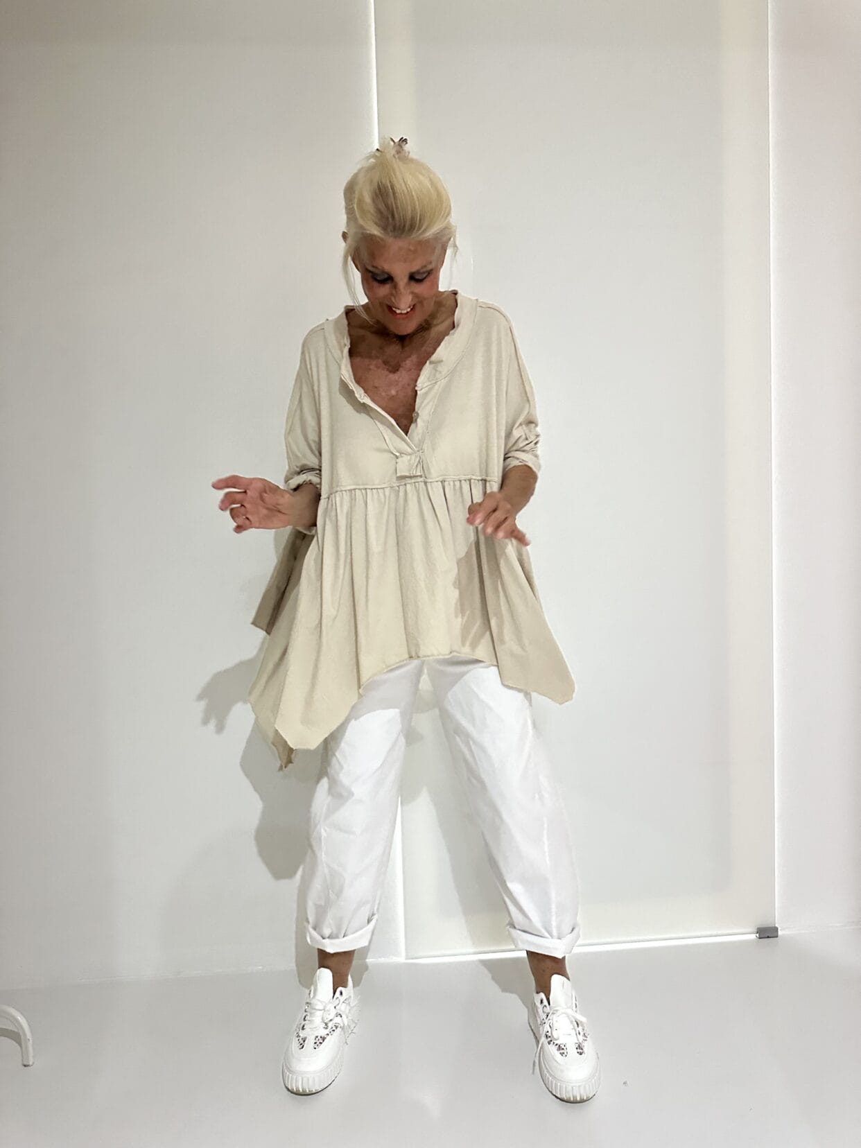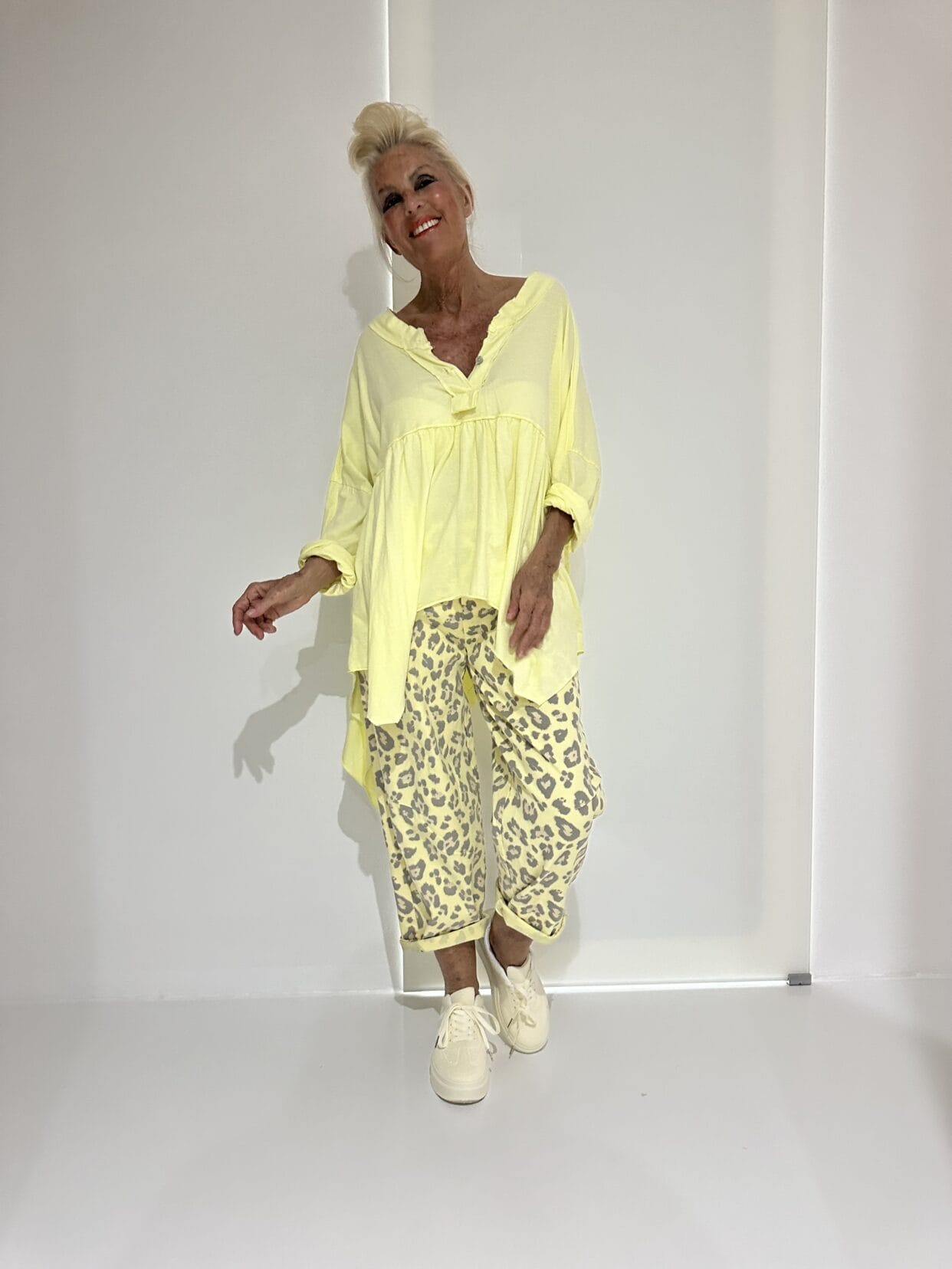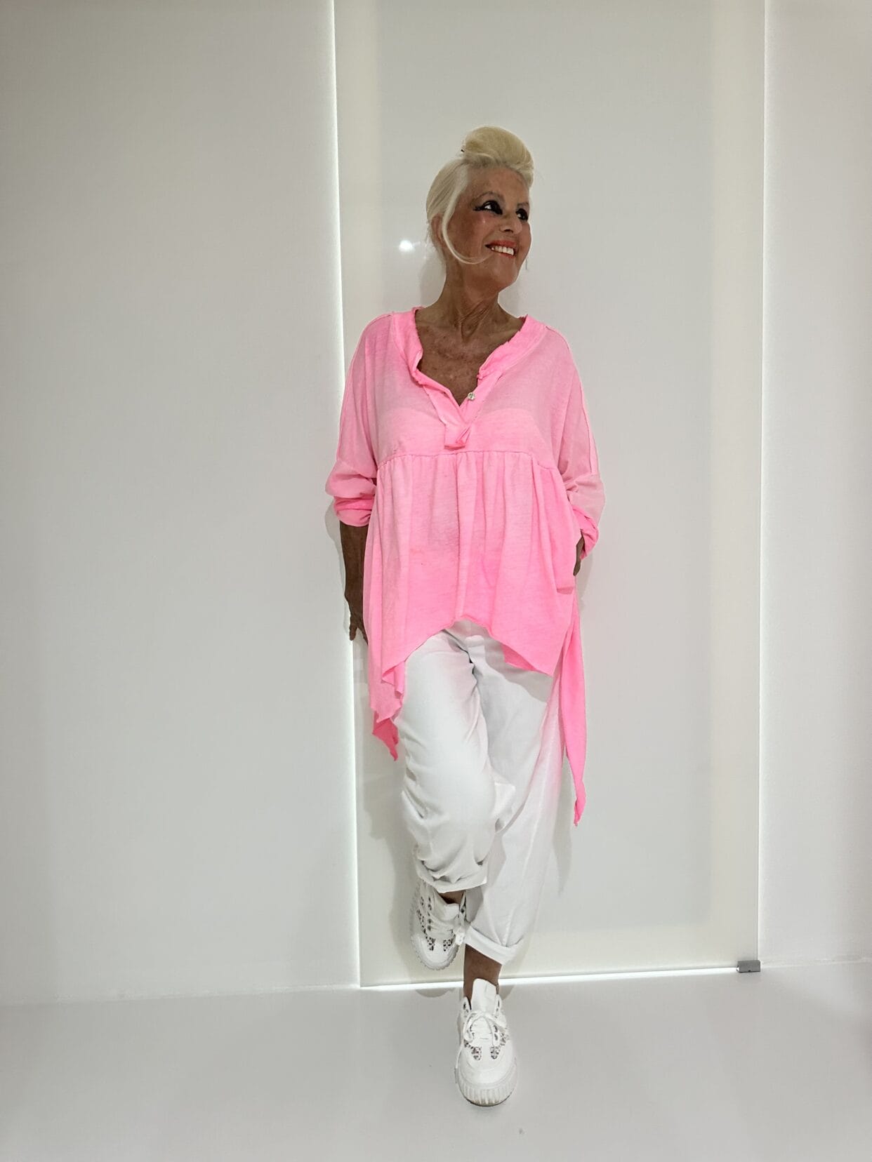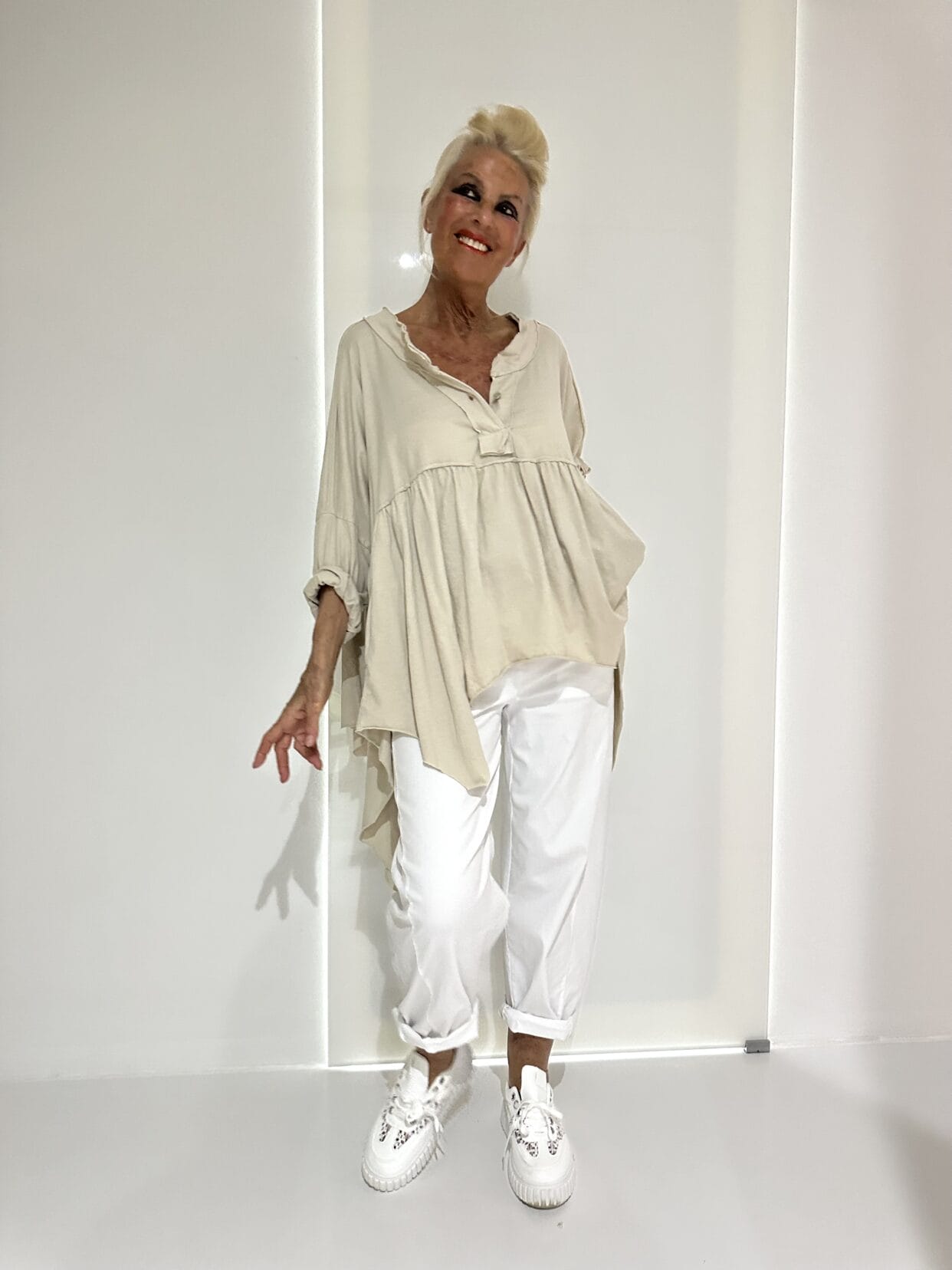 Leichte, seitlich spitz zulaufende Big-Oversize-Bluse in 4 Unifarben.