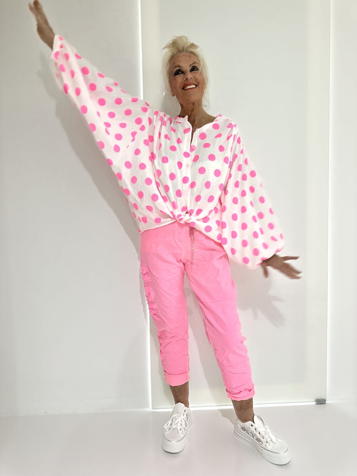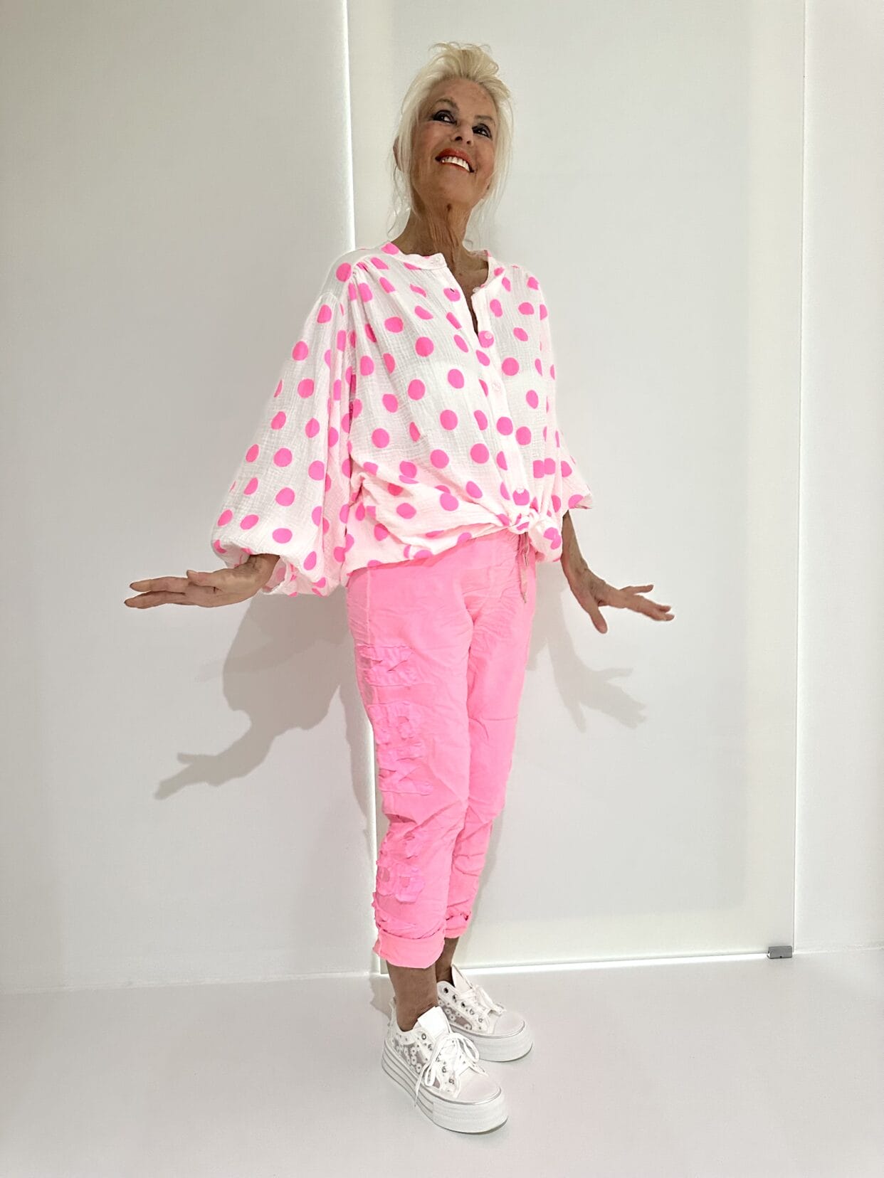 An den Schultern geraffte Musselinbluse in Grundfarbe Weiß mit XL-Punkten in zwei Farbvarianten.