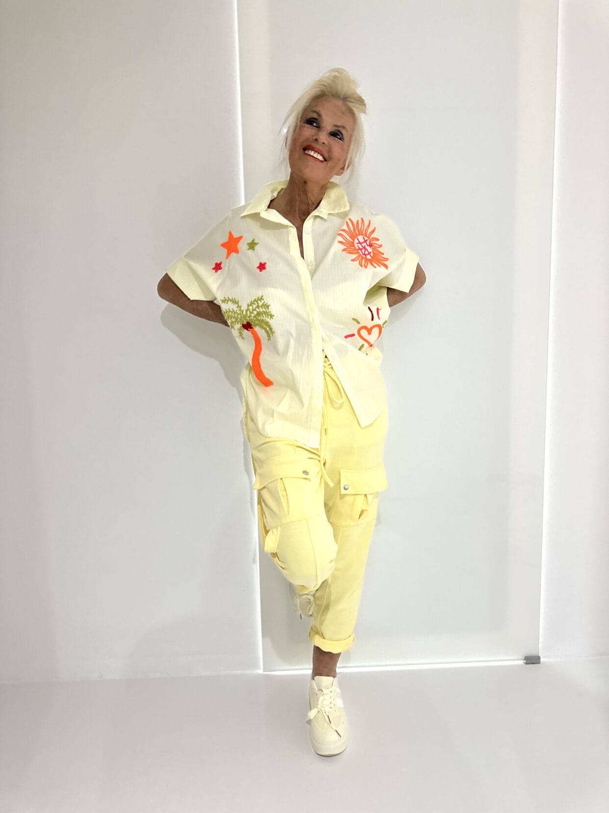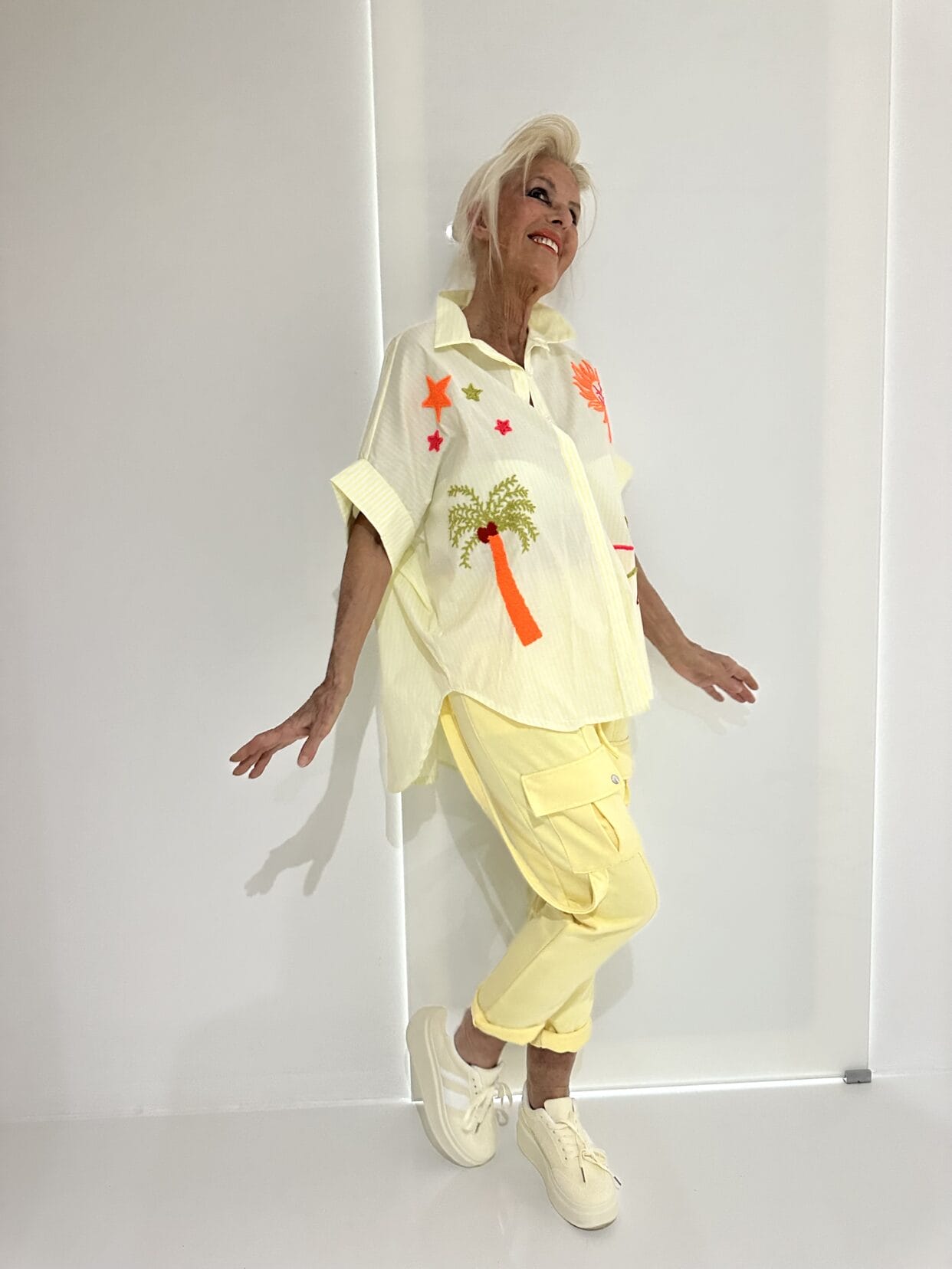 Gestreifte Oversize-Baumwollbluse mit farbigen, aufgenähten Motiven auf der Vorderseite.