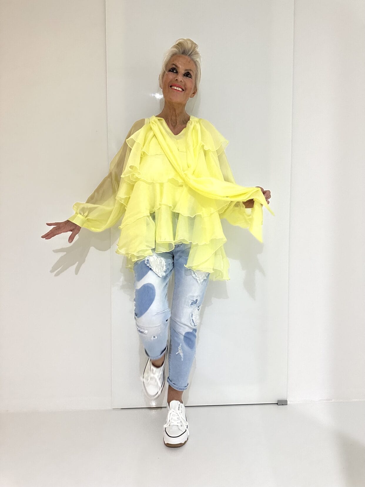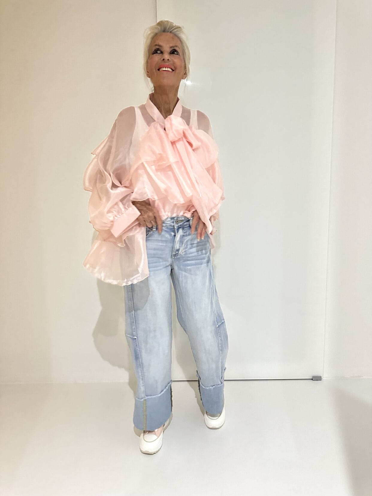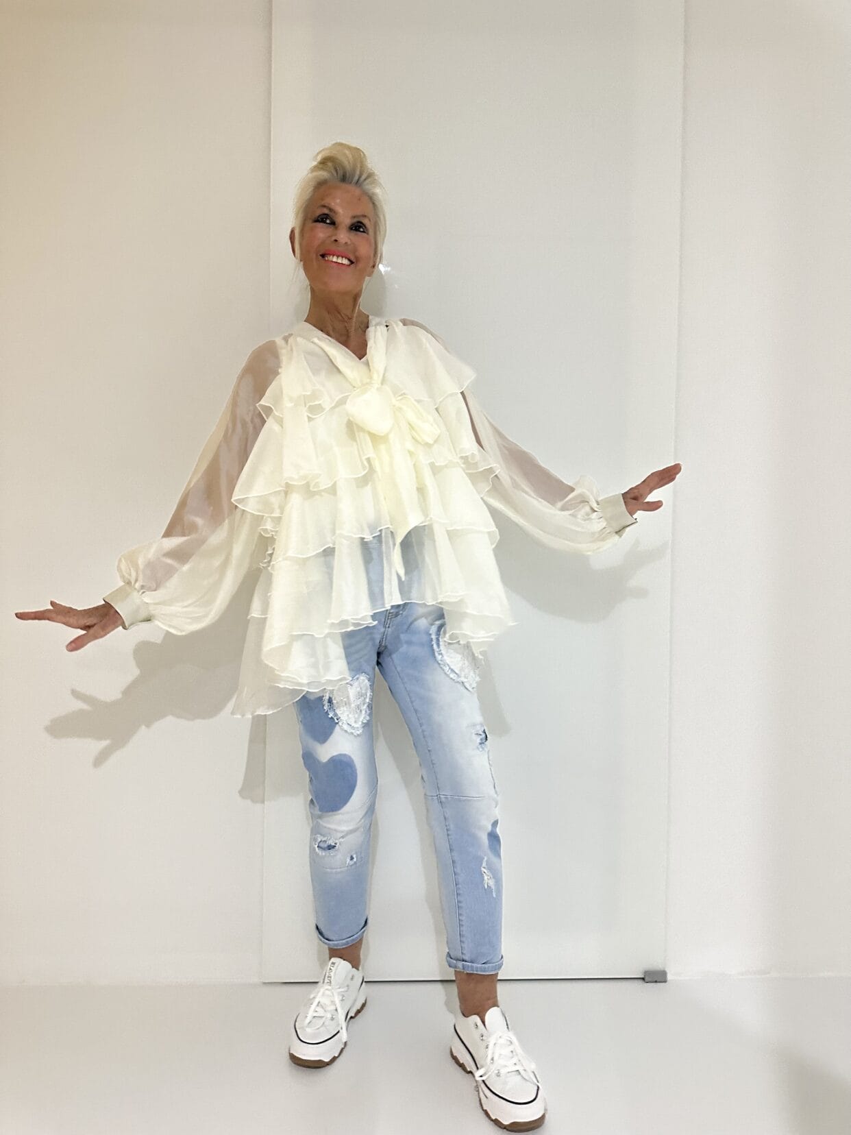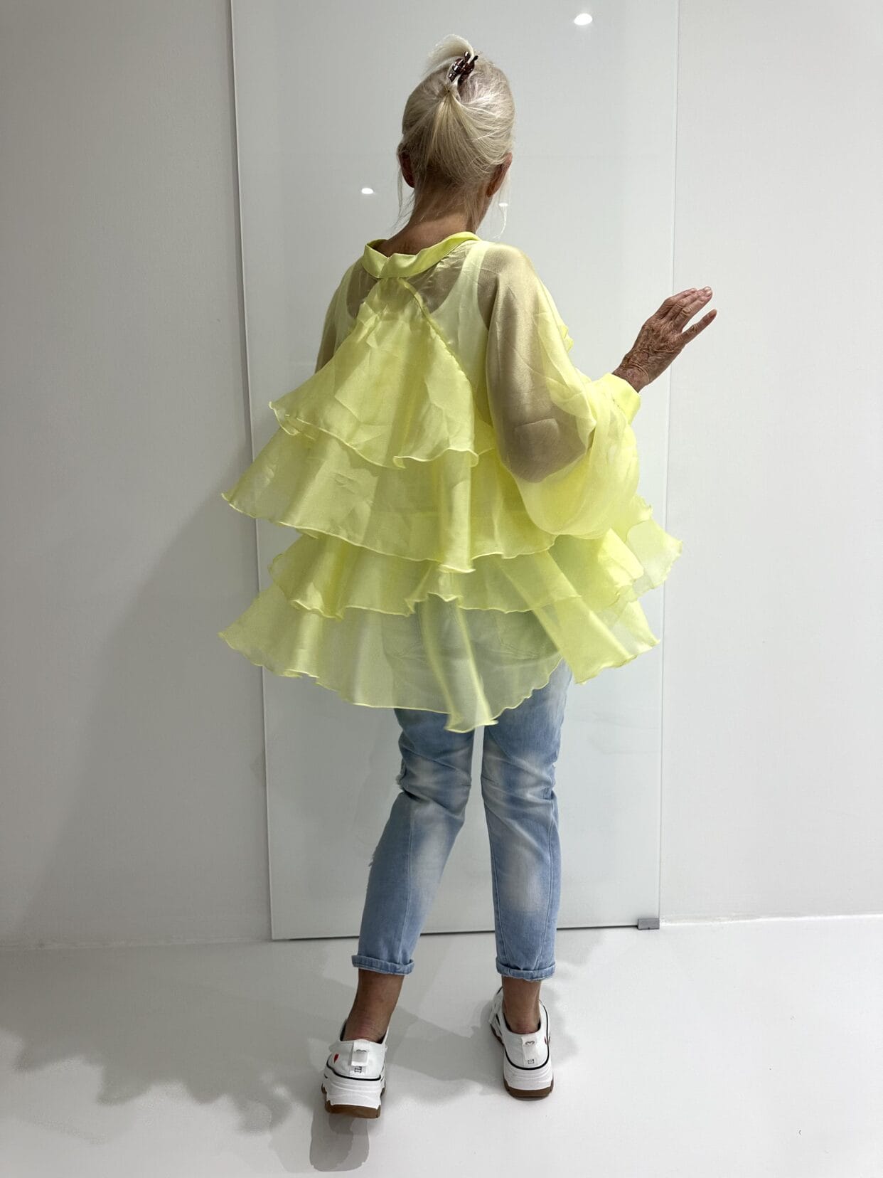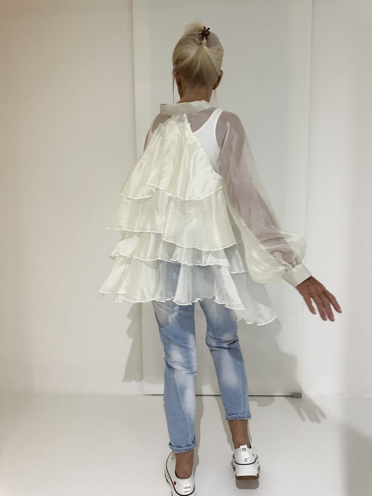 Transparente Seiden-Bluse mit Volants und einer großen Deko-Schleife am Kragen.