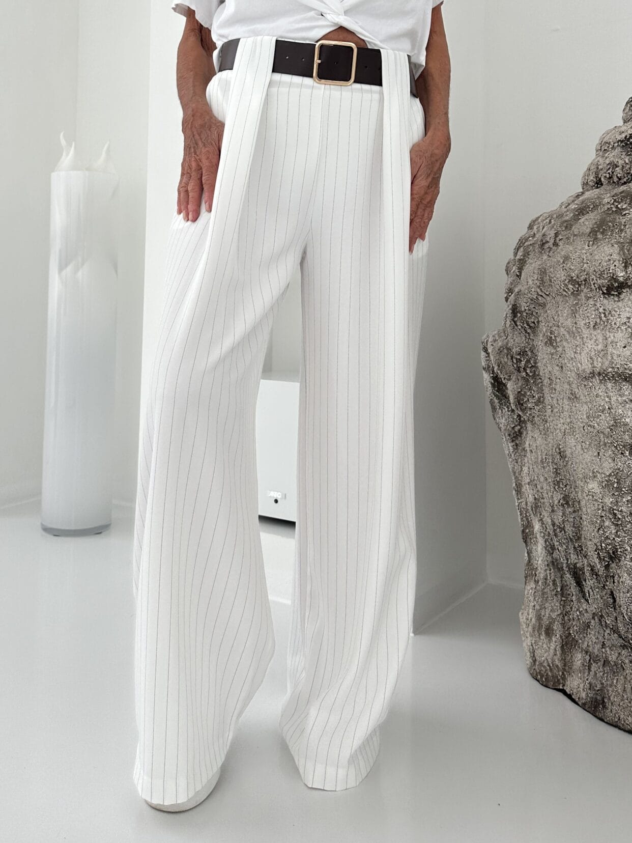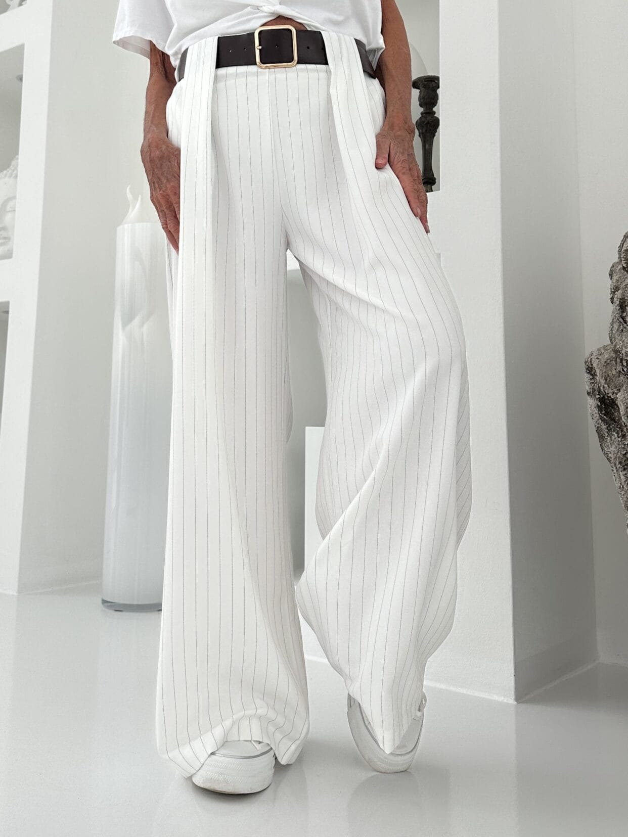 Modische Nadelstreifenhose in Grundfarbe Weiß mit breitem Gürtel.
