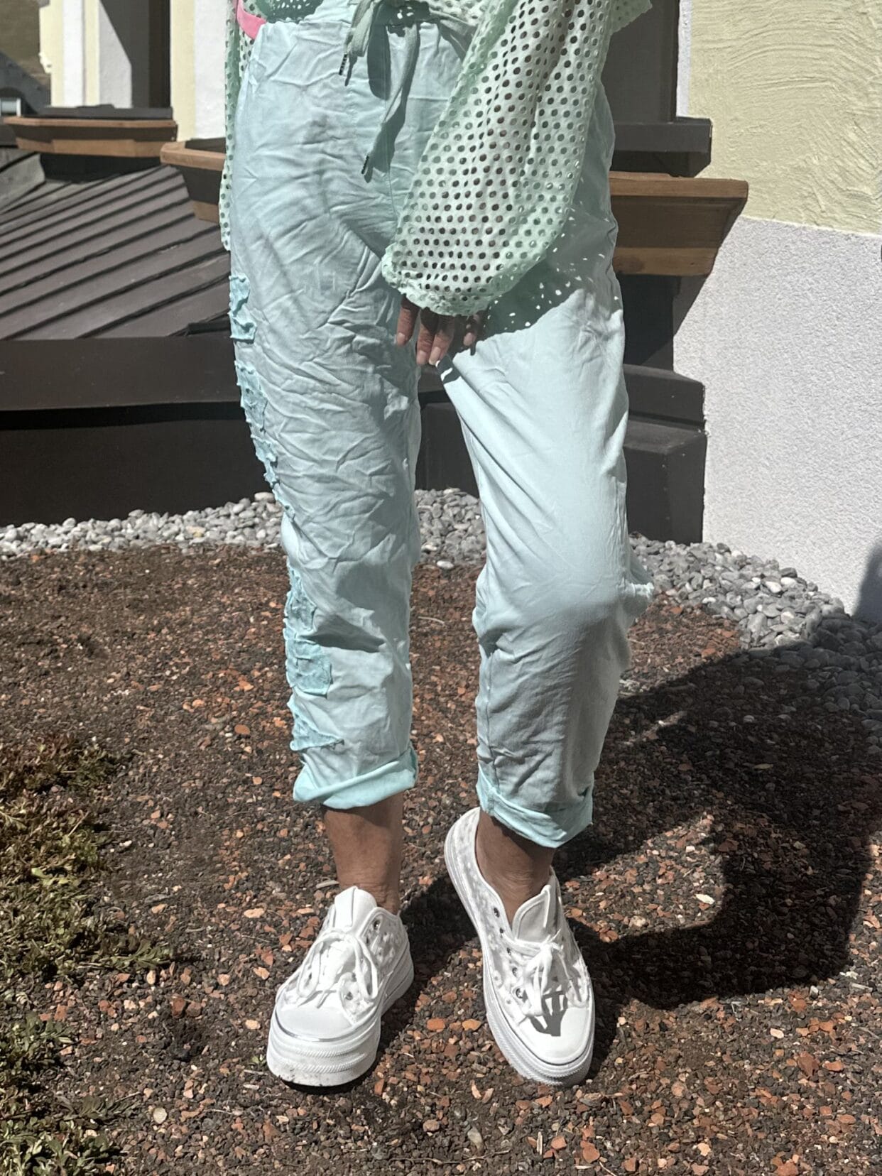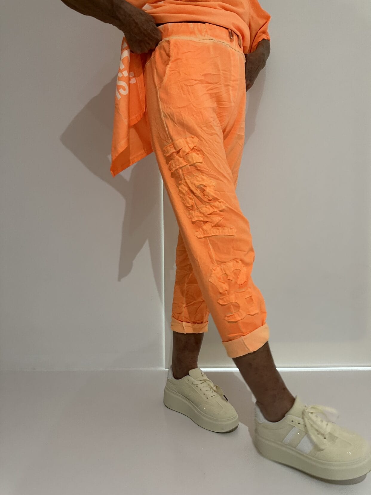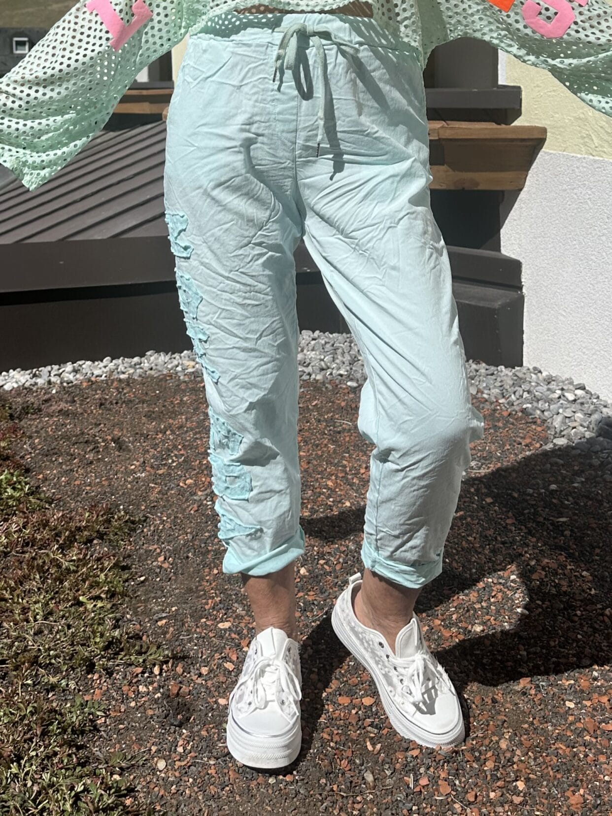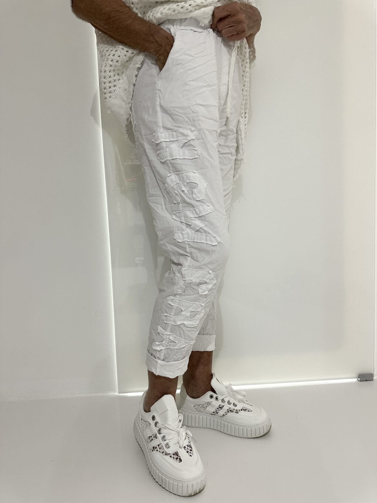 Schlupfhose mit Tunnelzug im Bund und einem seitlich aufgenähten Ton-in-Ton-Schriftzug.