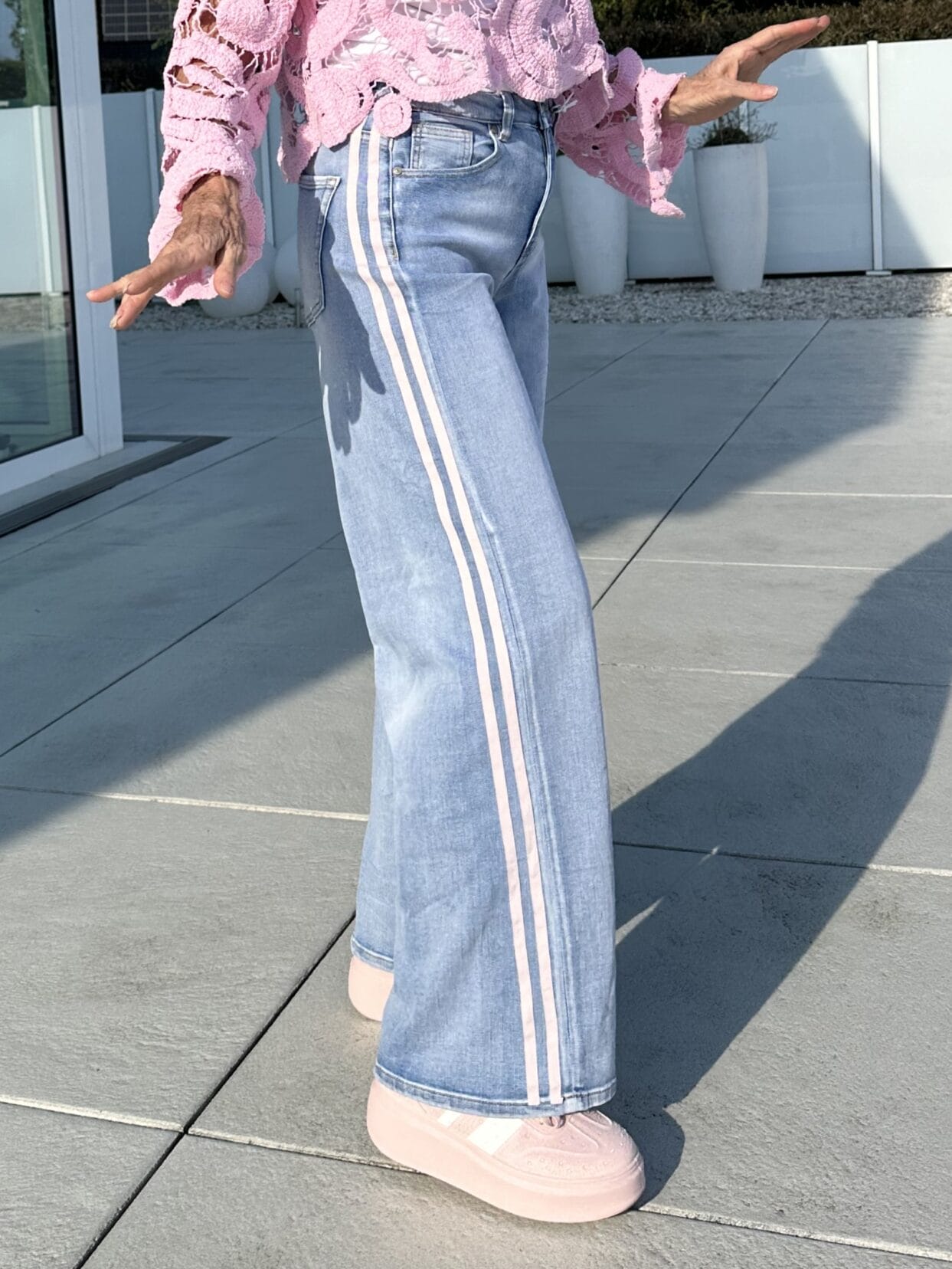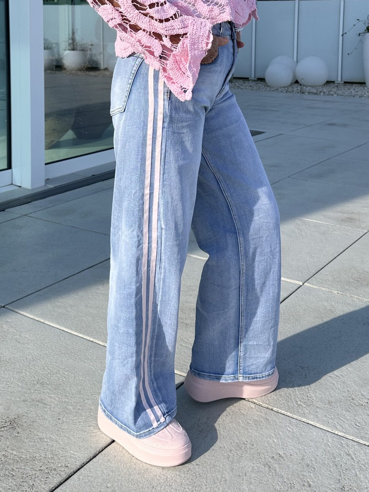 Hellblaue Jeans mit seitlichen Streifen.