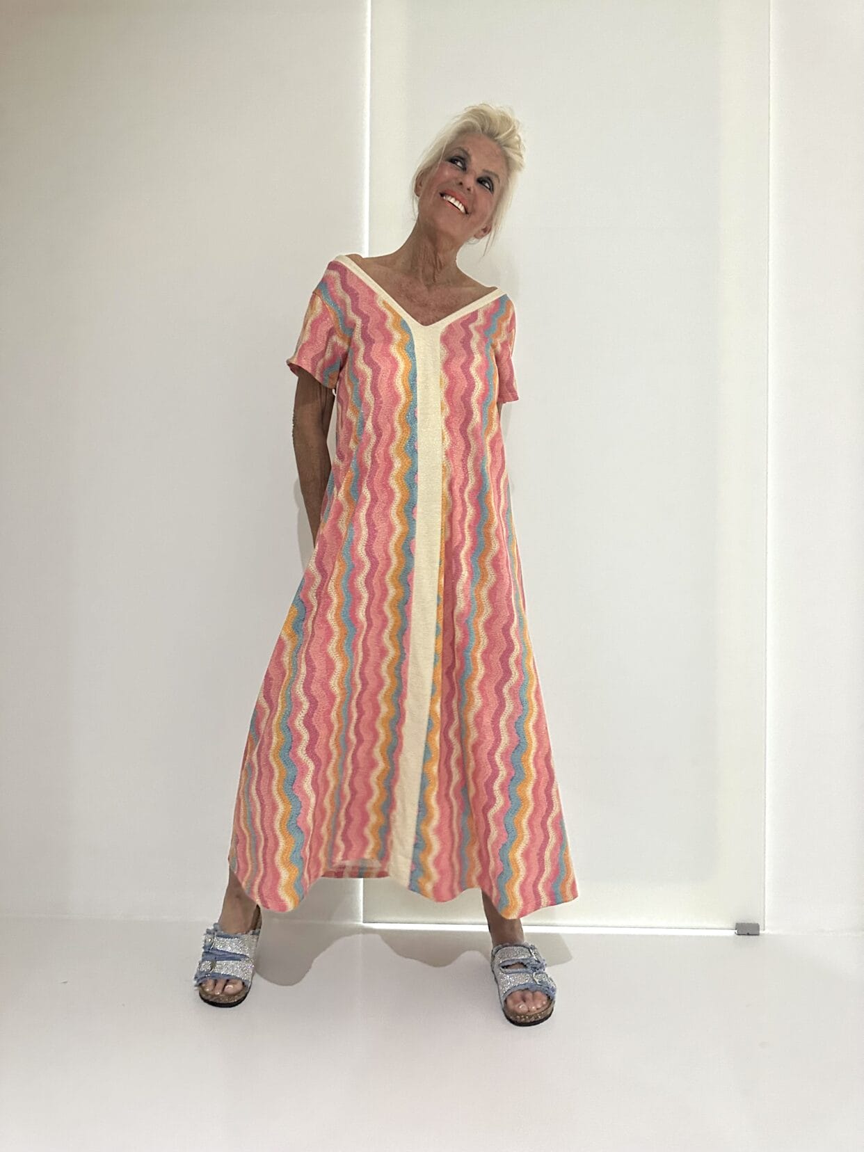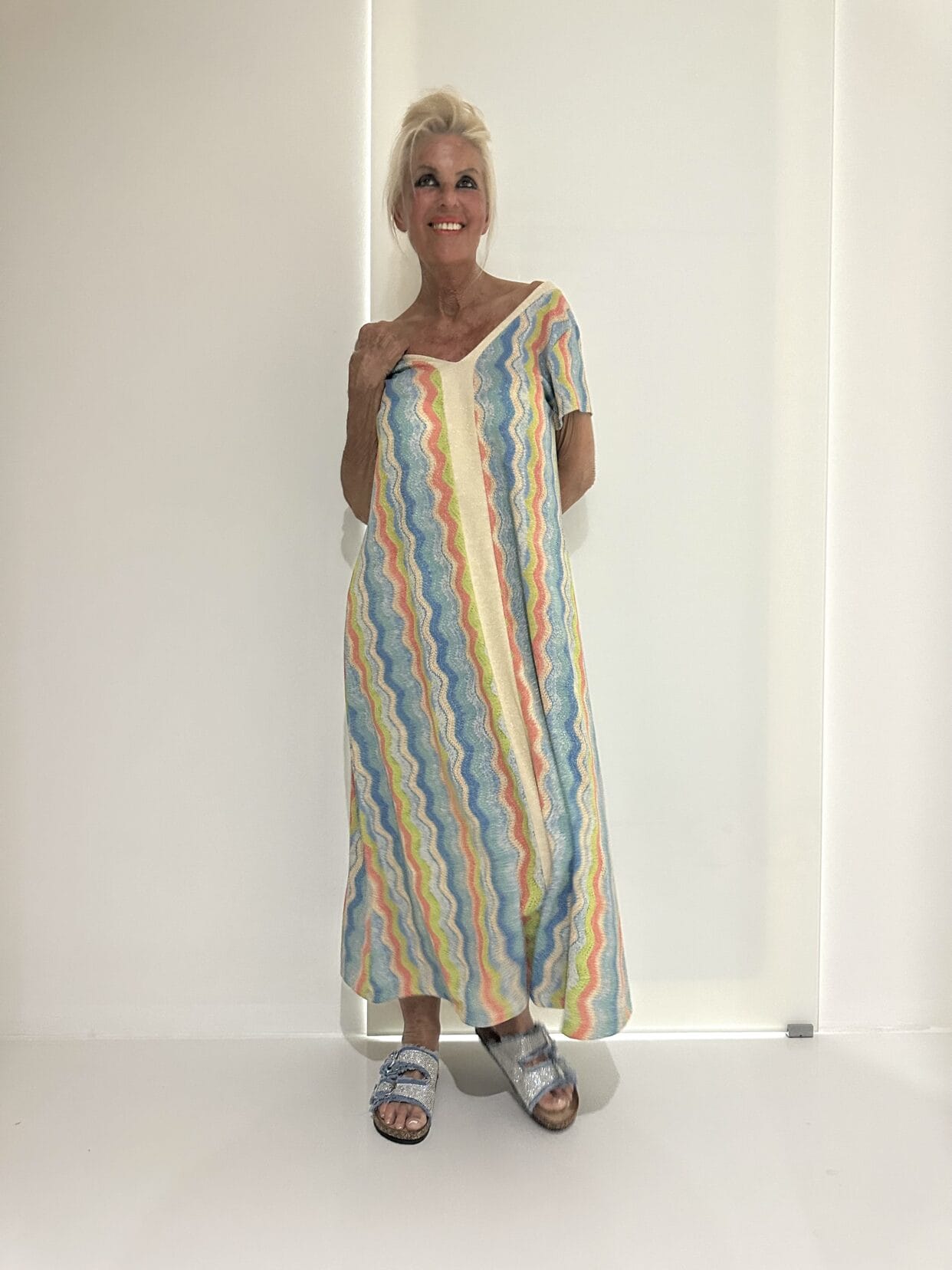 Schmal geschnittenes Longkleid mit Wellenmusterung in 2 Farbstyles.
